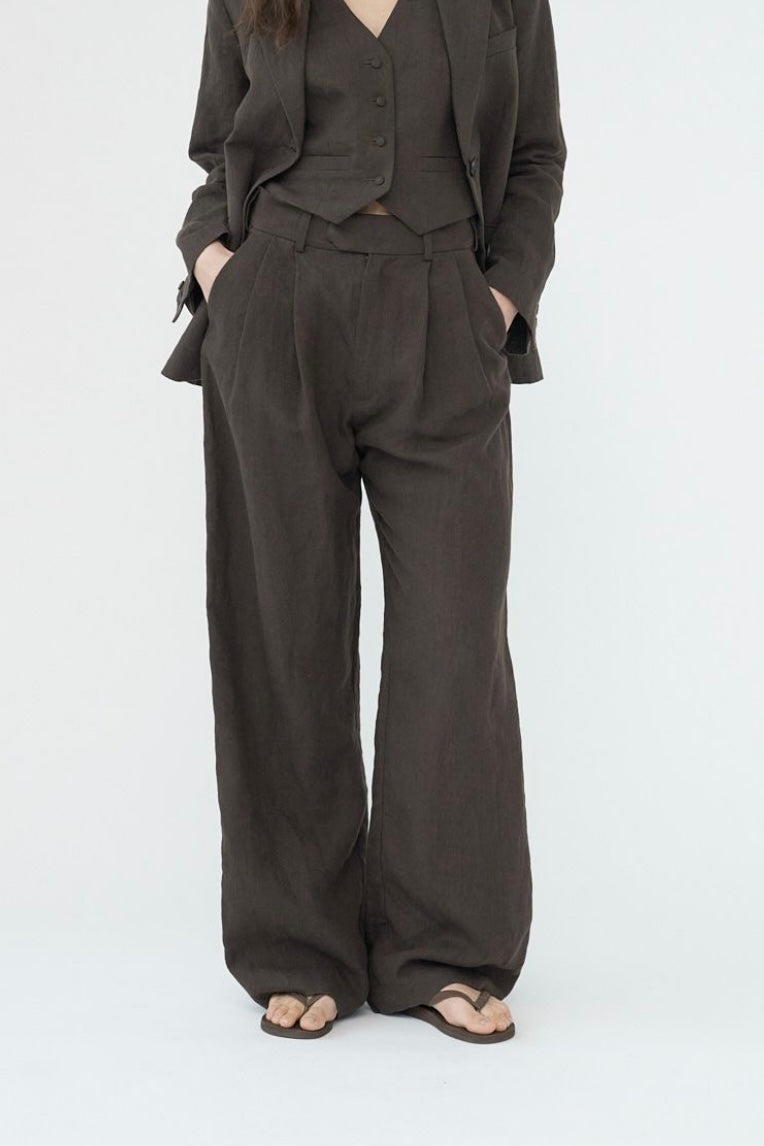 "Linen Wide Box Pants" fra Af Agger i brown. Vakre linbukser i en dyp brunfarge. Vid passform med leg i front.