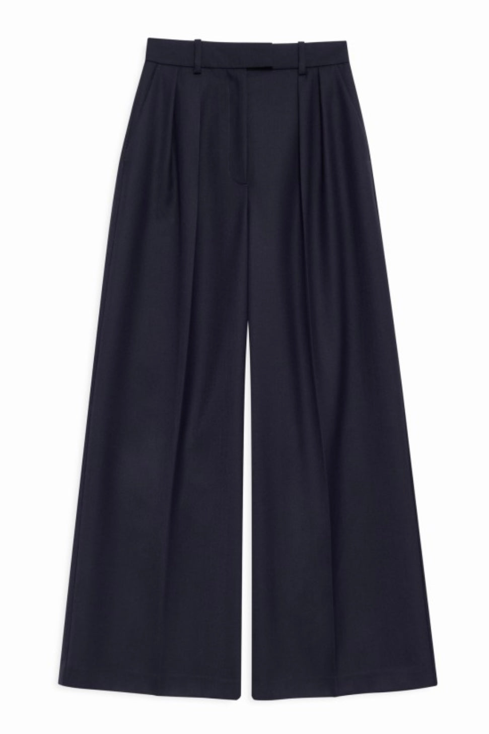 "Lou Trouser" fra Anine Bing i fargen midnigh blue. Dressbukse i en eksklusiv teksturert ullkvalitet. Skreddersydd design med doble draperinger foran, høyt liv og vide ben som faller pent. Lommer i sidene og en baklomme. Glidelåslukking.