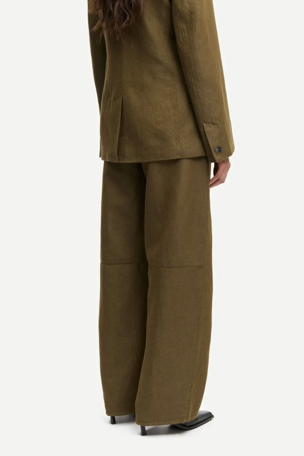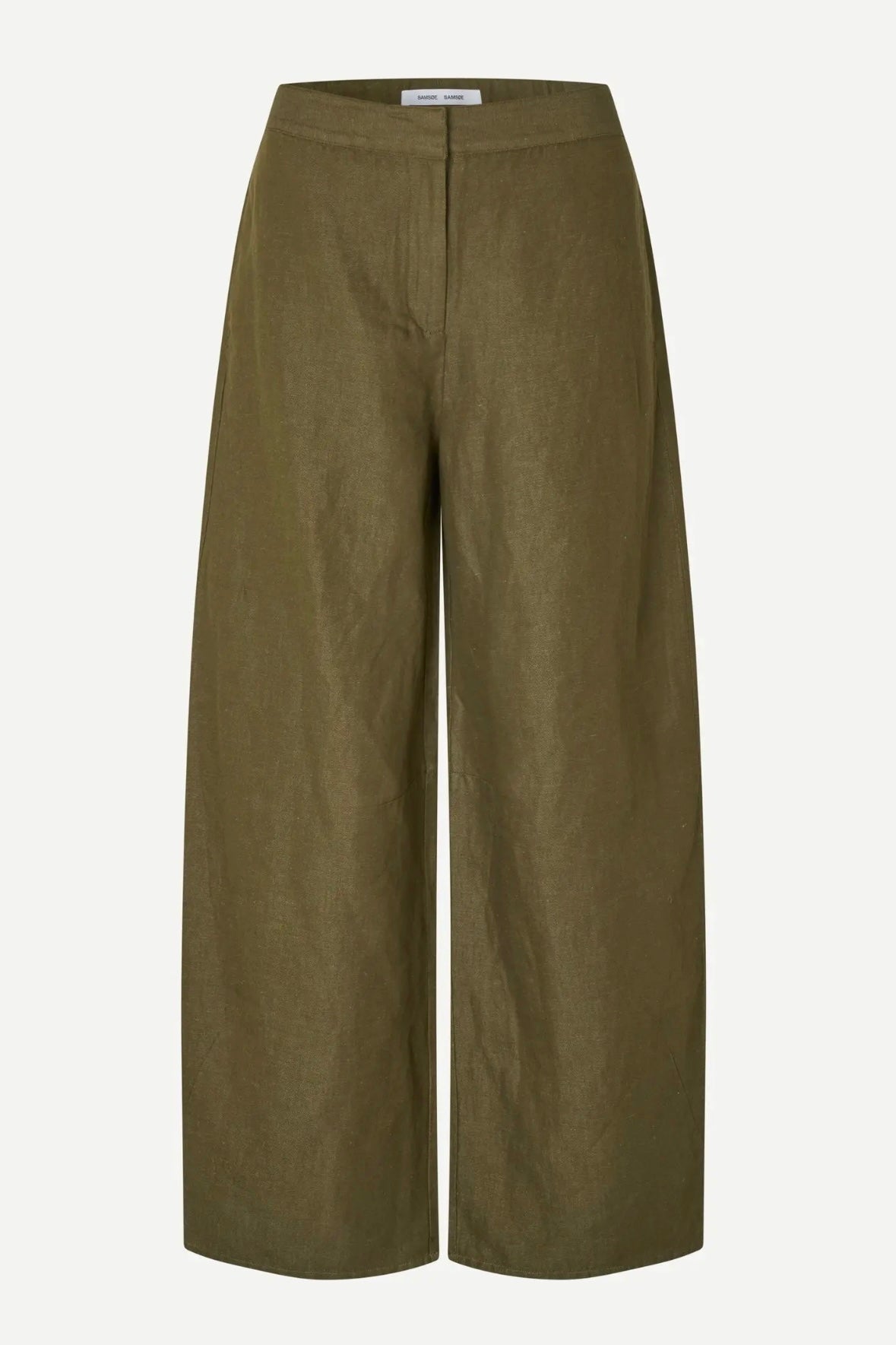 "Sarokos Trousers" fra Samsøe Samsøe i fargen Overland Trek Mel. Armygrønn bukse med løs passform og vide ben, laget i en lett og behagelig kvalitet av økologisk bomull og lin. Modellen har skjult hekte- og glidelåslukking i front som gir et rent og sofistikert uttrykk. Bak finner du klassiske passpolerte lommer som tilfører et skreddersydd preg. Den luftige materialblandingen gjør buksen perfekt til både hverdagsbruk og mer oppdressede antrekk, og den vide silhuetten gir et moderne og avslappet uttrykk. Modellen er 175 cm høy og bruker størrelse S.