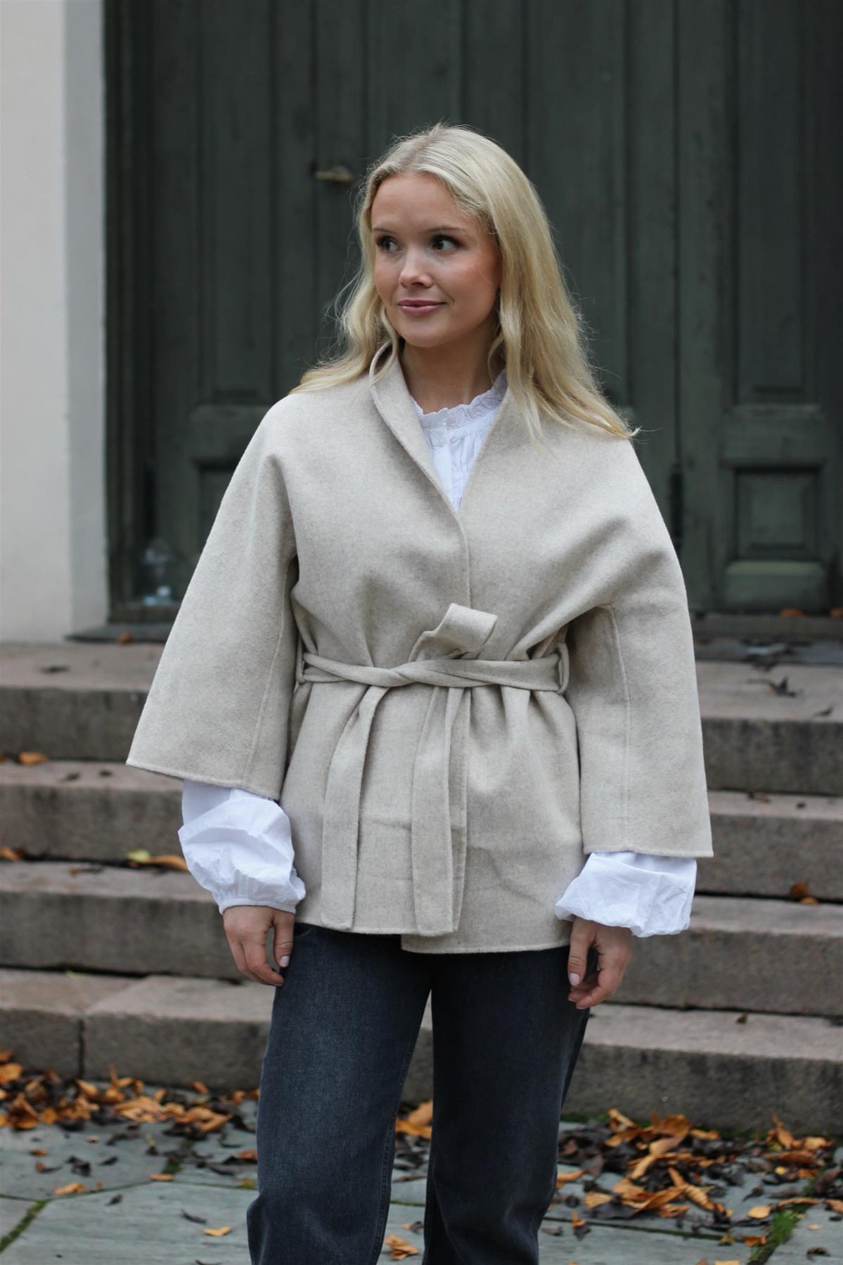 "Akiko Wool Jacket" fra Christian Aks. Elegant jakke laget av eksklusiv dobbelsidig ullkvalitet. Jakken har halvlange ermer, diskrete innerlommer i midjen og et belte i samme stoff som kan knytes for en mer figursydd silhuett. Designet for å brukes både innendørs og utendørs, denne jakken er like anvendelig over en kjole som med en bukse og topp. Normal i størrelsen.