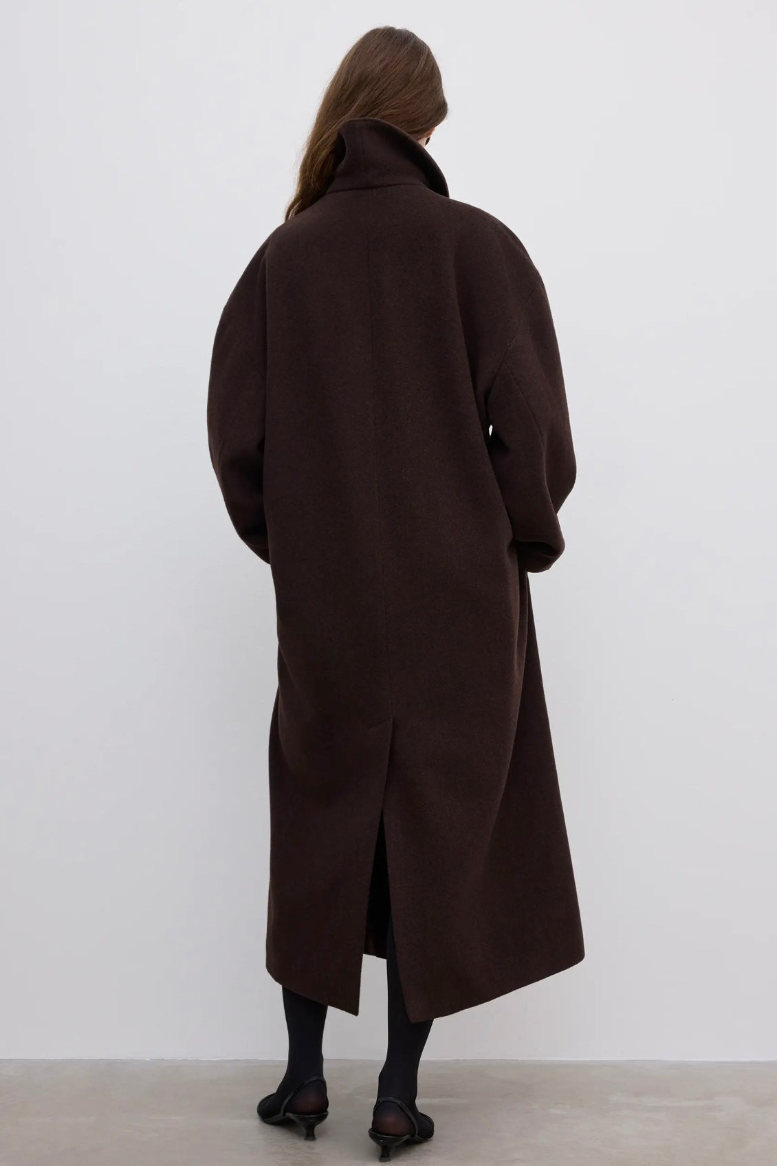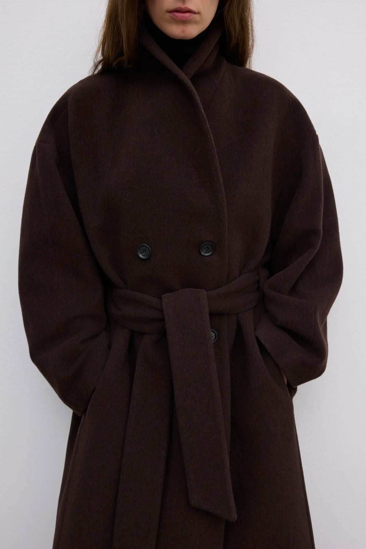 "Relaxed Wool Coat" fra Dagmar i fargen chocolate brown. Brun dobbeltspent kåpe i full lengde, laget i varmende ullblanding. Kåpen har en myk kokong-silhuett med droppede skuldre, avrundede ermer og et elegant sjalskrage. Den er helfôret og detaljer som håndsydde sømmer, in-sømslommer og et avtagbart belte understreker det sofistikerte uttrykket. En tidløs signaturkåpe som kombinerer komfort med moderne eleganse.