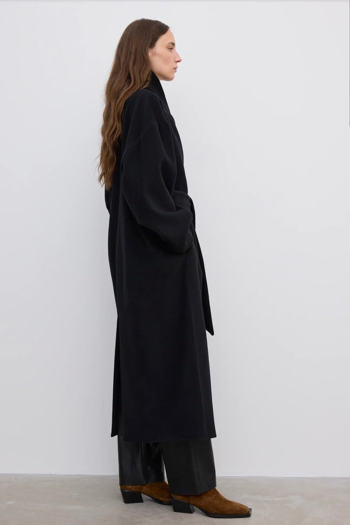 "Relaxed Wool Coat" fra Dagmar i sort. Klassisk sort dobbeltspent kåpe i full lengde, laget i varmende ullblanding. Kåpen har en myk kokong-silhuett med droppede skuldre, avrundede ermer og et elegant sjalskrage. Den er helfôret og detaljer som håndsydde sømmer, in-sømslommer og et avtagbart belte understreker det sofistikerte uttrykket. En tidløs signaturkåpe som kombinerer komfort med moderne eleganse.