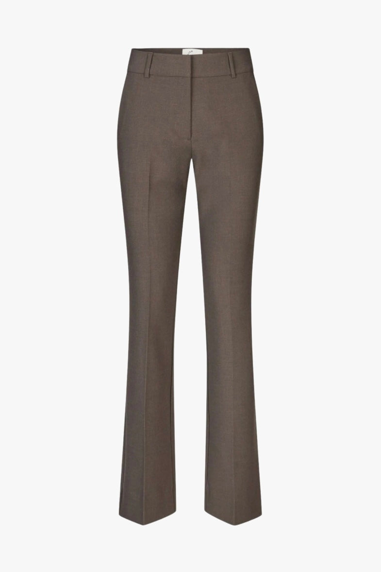 "Clara Long" fra Five Units i fargen Mud Brown. Elegante bukser med en klassisk flared fit. Designet med mid-waist, hviler de naturlig på hoftene, fremhever silhuetten og faller flatterende fra kneet og ned. Pressede folder og rene detaljer på bena gir et sofistikert preg, mens den allsidige passformen gjør dem enkle å style både til jobb og fritid. En tidløs bukse med et moderne uttrykk og et utsøkt snitt.