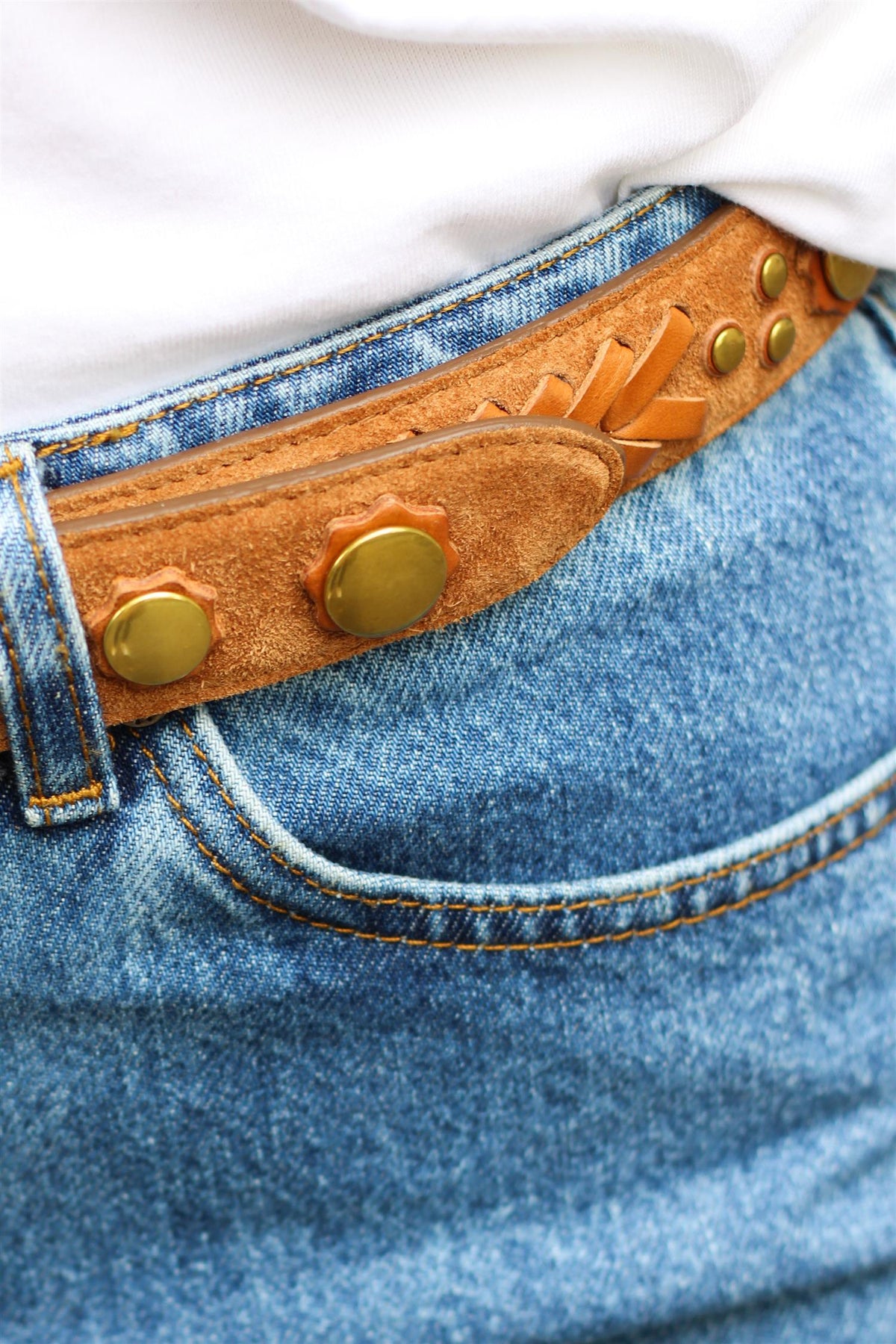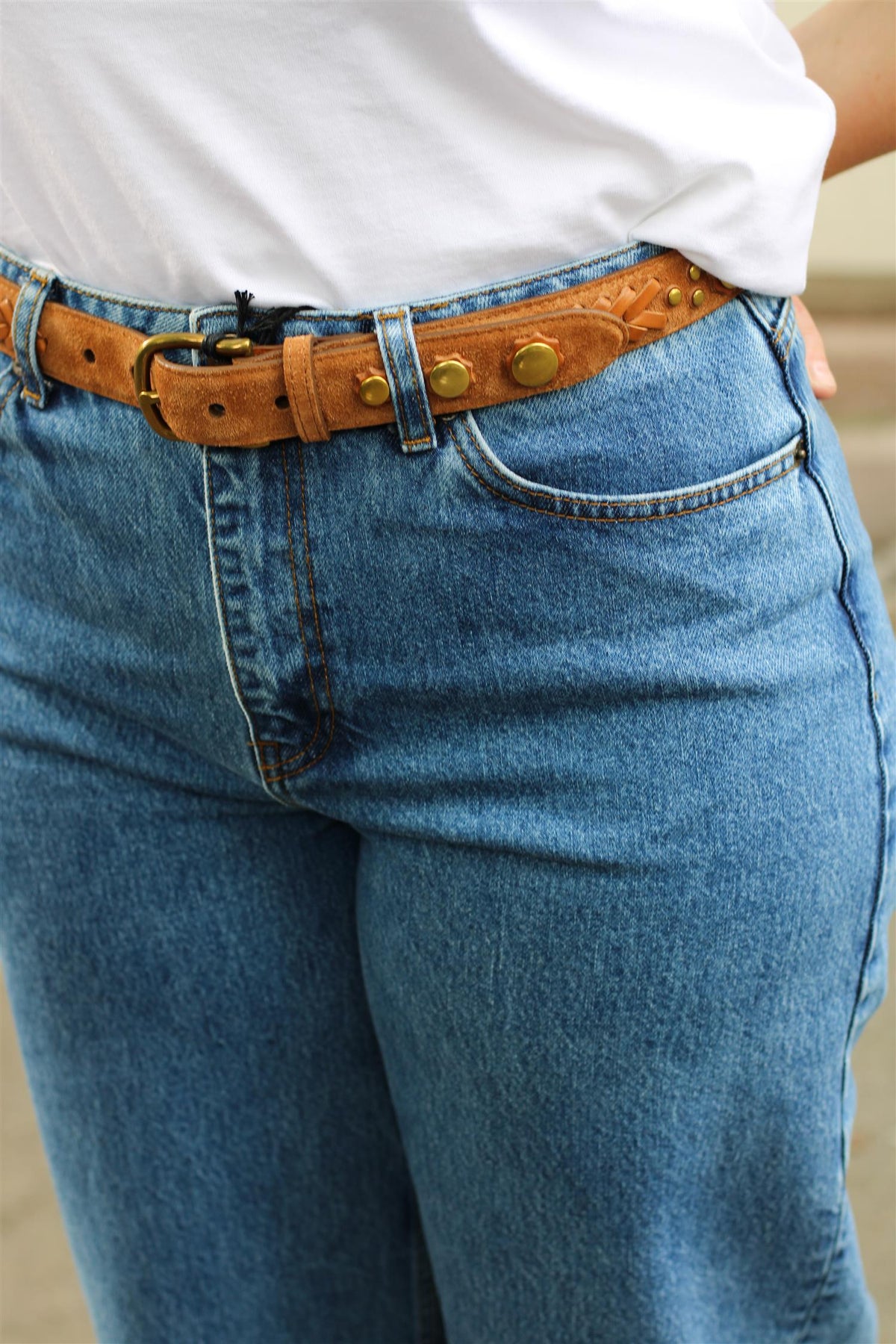 Beltet har messing-nagler rundt hele, og reguleres med 5 hull. Kommer i 3 størrelser.