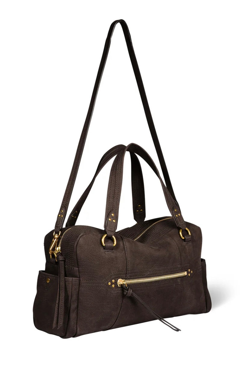 "Lucky Bowling" fra Jerome Dreyfuss i fargenimprime croco moka. Bowling-veske i brunt skinn med gullfarget detaljer og ikoniske studs. Kan bæres på skulderen, crossover eller i hånden - avtagbar skulderreim medfølger. Utvendig glidelåslomme og to lapplommer. På innsiden er det en lapplomme og en glidelåslomme.