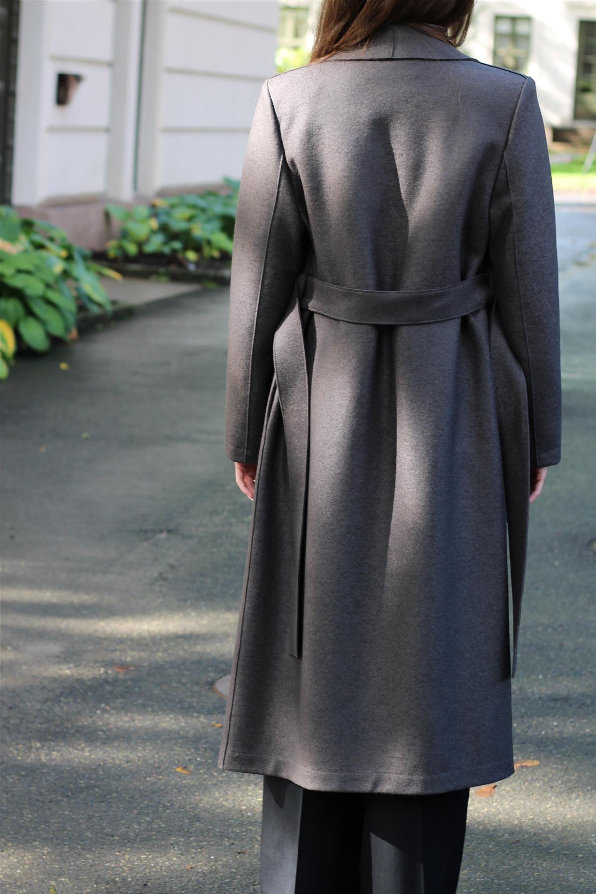 "Women shawl collar coat pressed wool" fra Harris Wharf London i fargen Graphite. Lang kåpe i en elegant dyp gråfarge i 100% ull. Klassisk fasong med knytebelte. Lommer i siden.