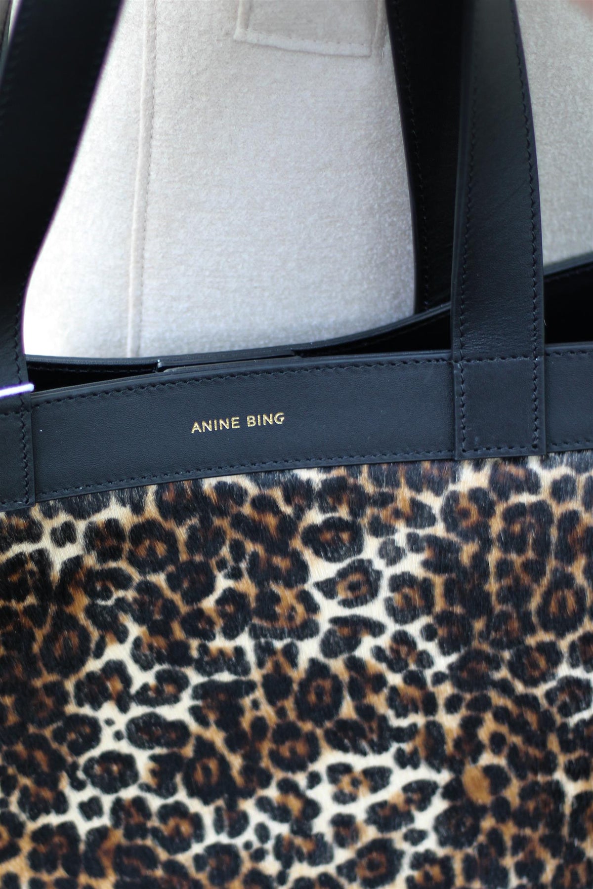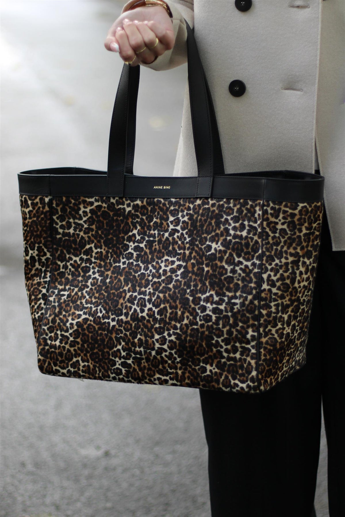 Medium Rio Tote i Leopard Calf Hair fra Anine Bing. Medium Rio Tote er en sofistikert hverdagsveske i kalvehår med sesongens vintage-inspirerte leopardmønster. Modellen er uforet for et lett uttrykk og har to solide svarte stropper som gjør den enkel å bære. På fronten er vesken dekorert med Anine Bings ikoniske monogram i svart, som gir et markant og luksuriøst preg.