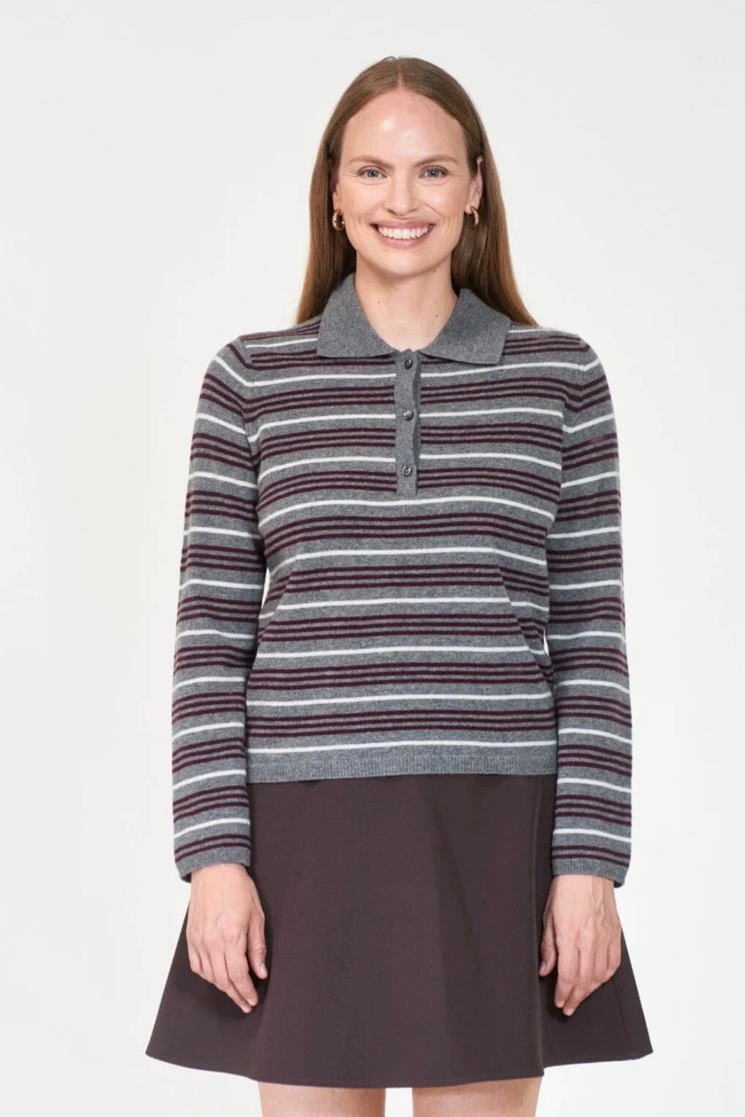 Arnie Says – Cassie Stripe Grey multi. Cassie fra Arnie Says er en klassisk, stripete poloskjorte i en eksklusiv ullblanding. Med hele 80 % ull føles den myk og behagelig mot huden, samtidig som den har en fast og nett fasong som gir et velkledd og strukturert uttrykk. Den tidløse kragen og knappestolpen i front gjør Cassie til et allsidig plagg som enkelt kan styles både til jeans og mer dressede bukser. En tidløs garderobefavoritt som løfter ethvert antrekk. Materiale: