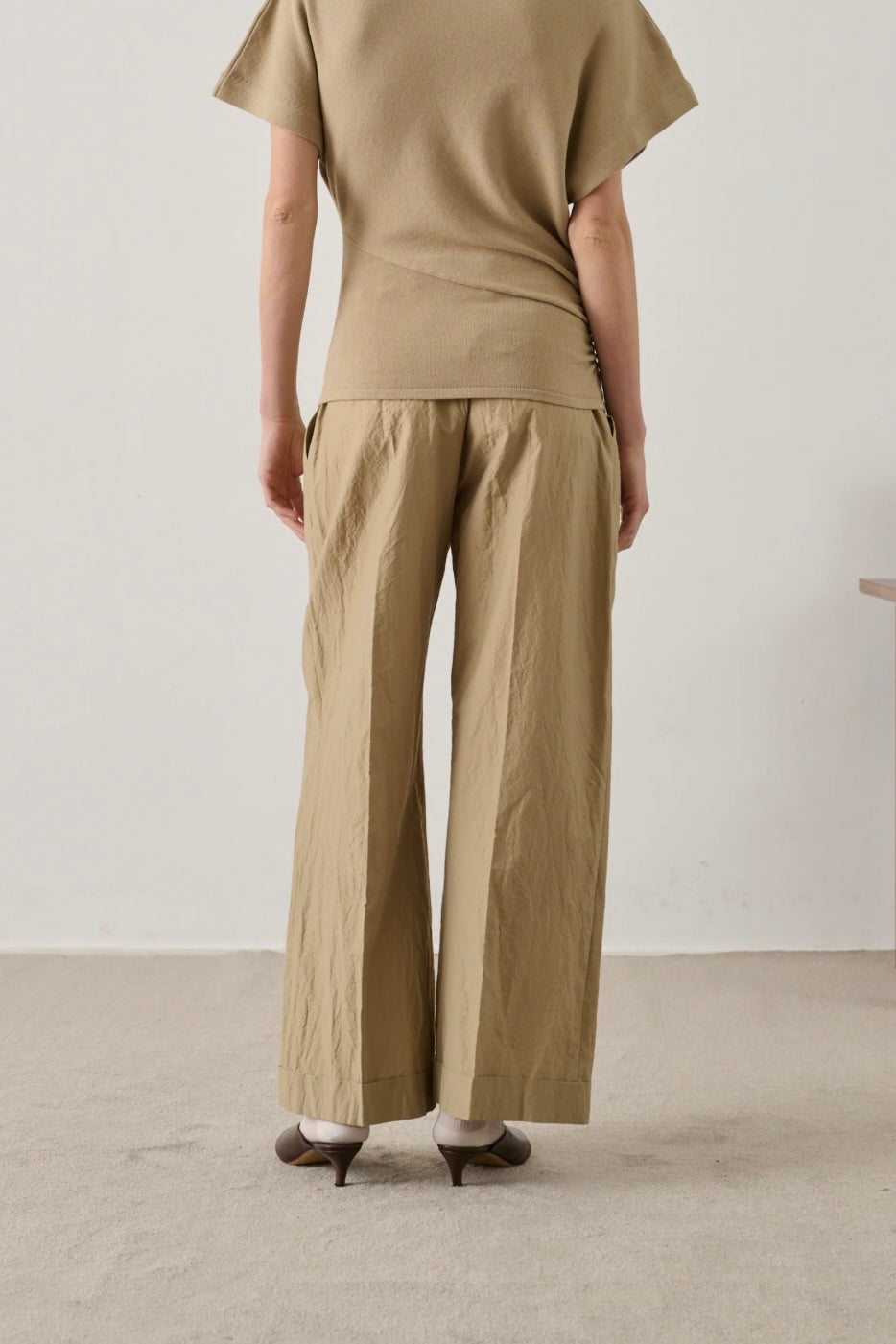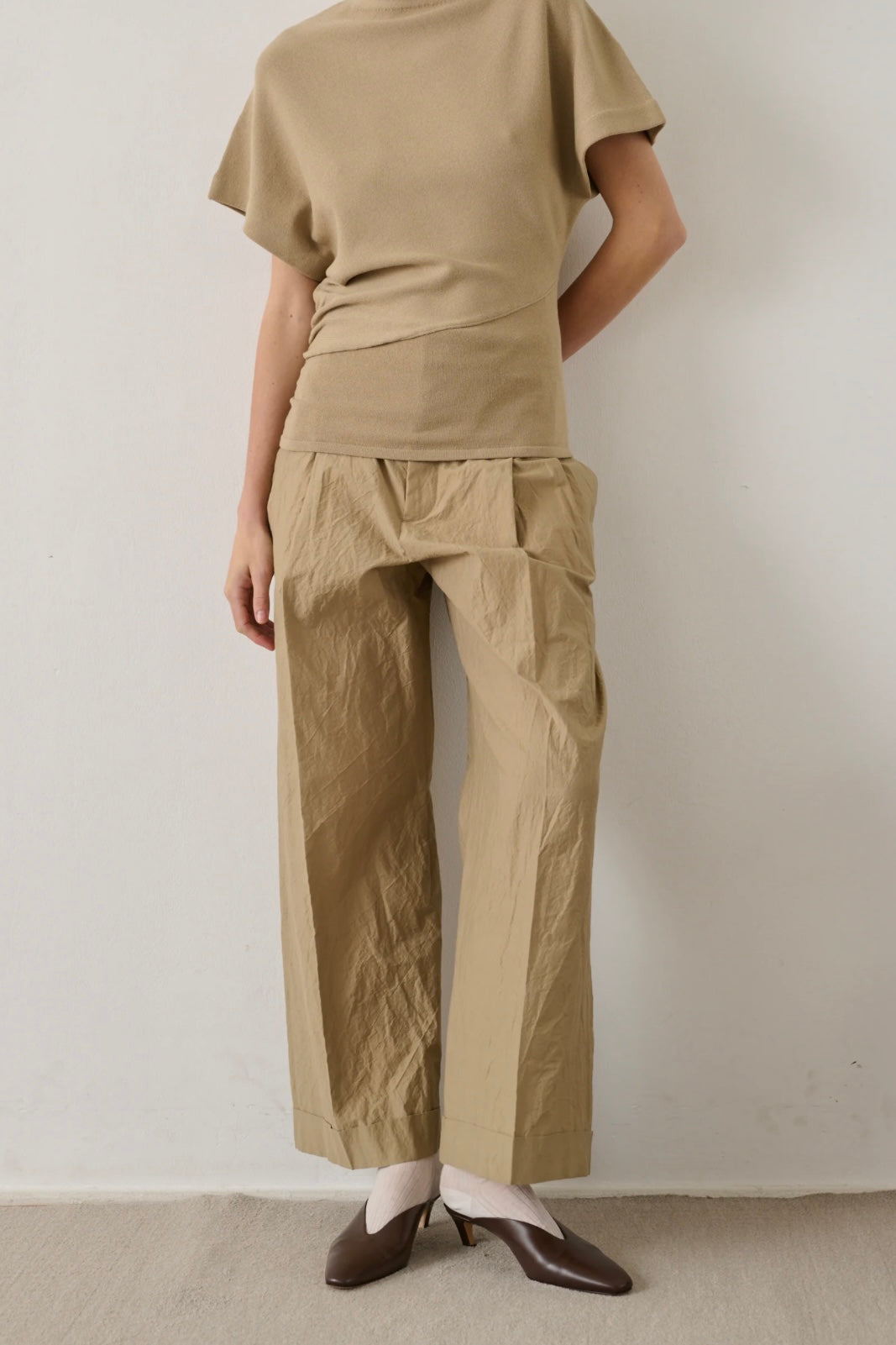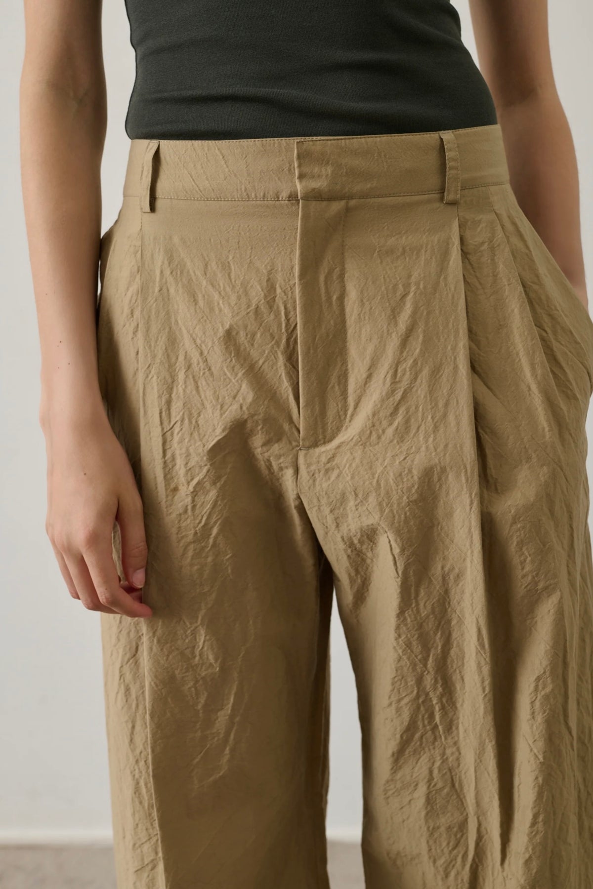Watson Trousers fra Soeur. Watson er en elegant bukse fra Soeur med høyt liv og vid silhuett, laget i lett bomullspoplin med en subtil krinklet struktur. De markerte leggene og pressede foldene langs benet gir et raffinert og gjennomført uttrykk. Buksen lukkes med glidelås, hekte og knapp, og har skrålommer i front samt paspolerte baklommer. Den vide fasongen og det lette materialet gjør den både komfortabel og stilren – et tidløst plagg som passer like godt til hverdags som til mer formelle anledninger.