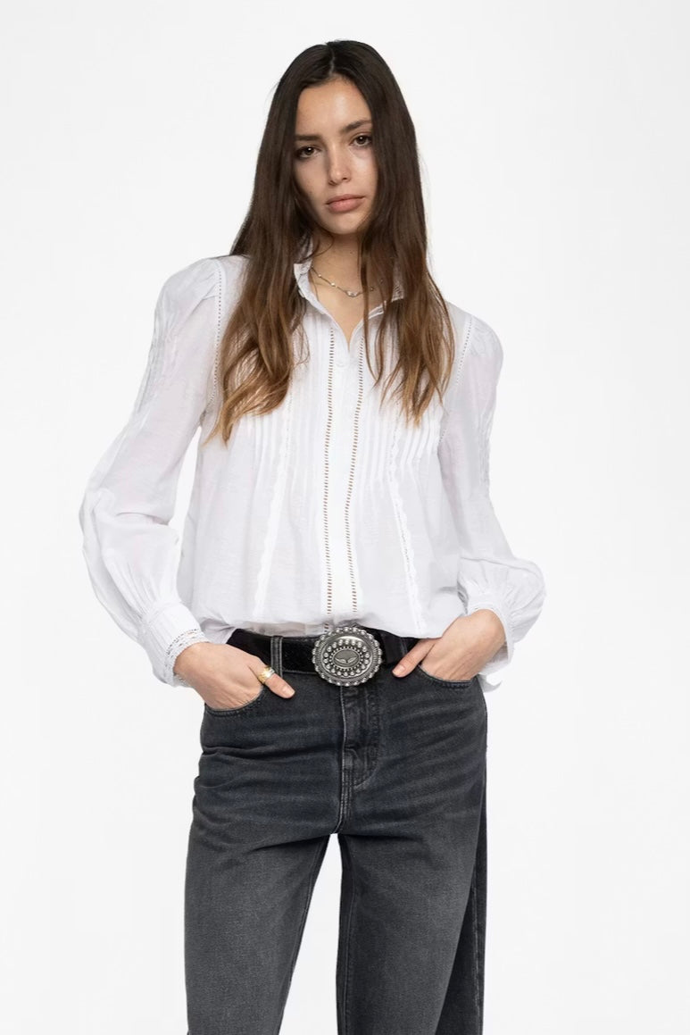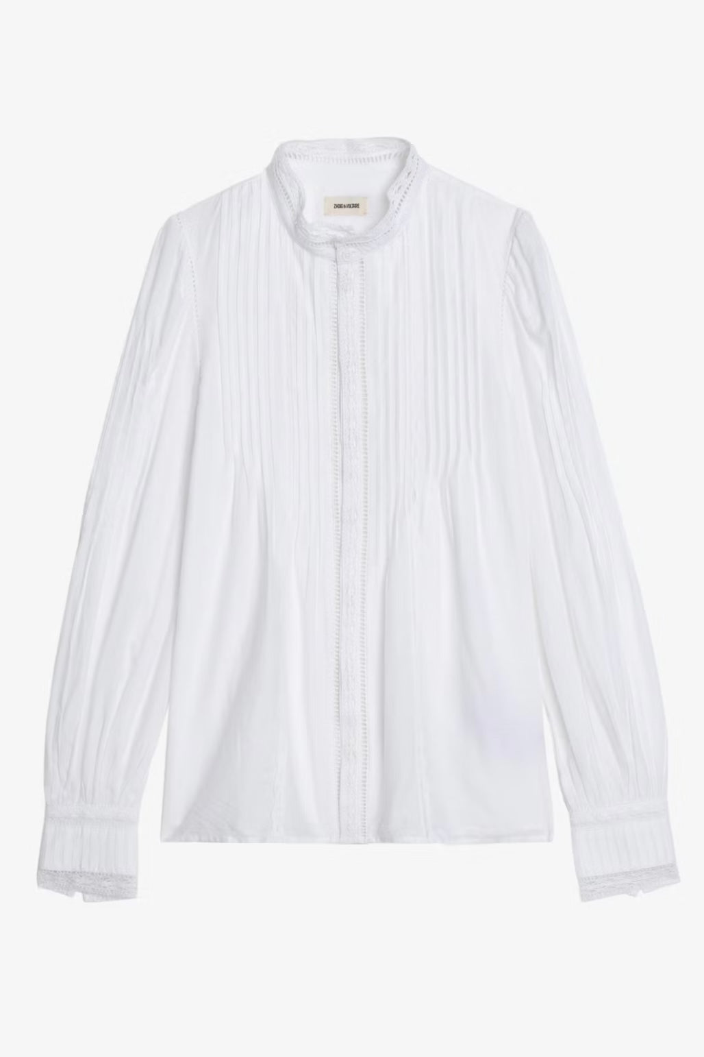 "Shirt Timz" fra Zadig & Voltaire er en lett og feminin skjorte med ståkrage og lange ermer, laget i en myk og behagelig bomulls- og viskoseblanding. På ryggen prydes skjorten av Zadig & Voltaires ikoniske broderte vinger – en signaturdetalj som gir plagget et karakteristisk og gjennomført uttrykk. Silhuetten er ren og tidløs, og skjorten er like enkel å style til hverdags som til mer pyntede anledninger. Passformen er normal i størrelsen – velg din vanlige størrelse.