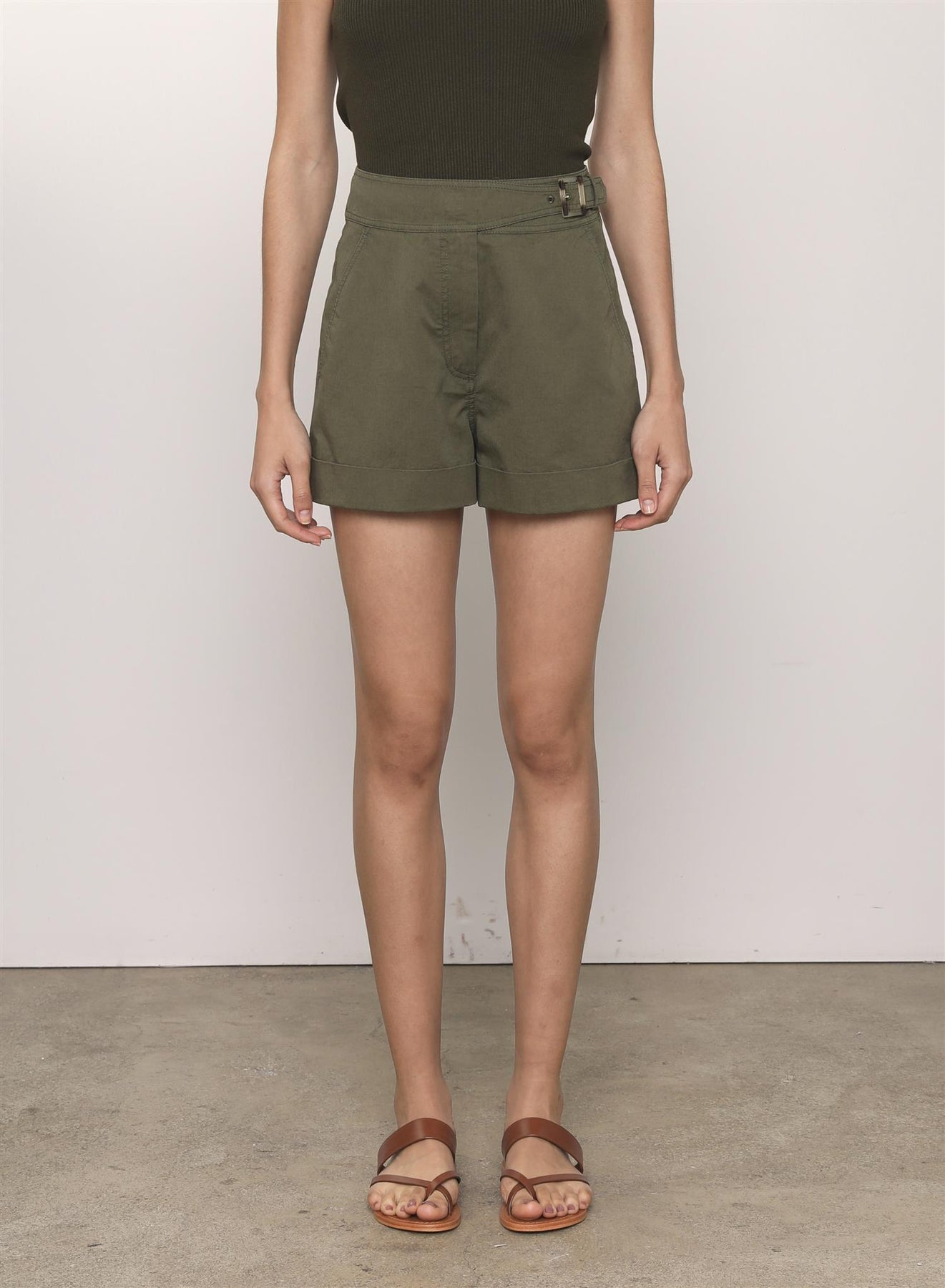 Ginny Shorts fra Vanessa Bruno i fargen Vegetal. Armygrønn kort shorts med dekorativ spenne for justering i linningen. Lommer i sidene.