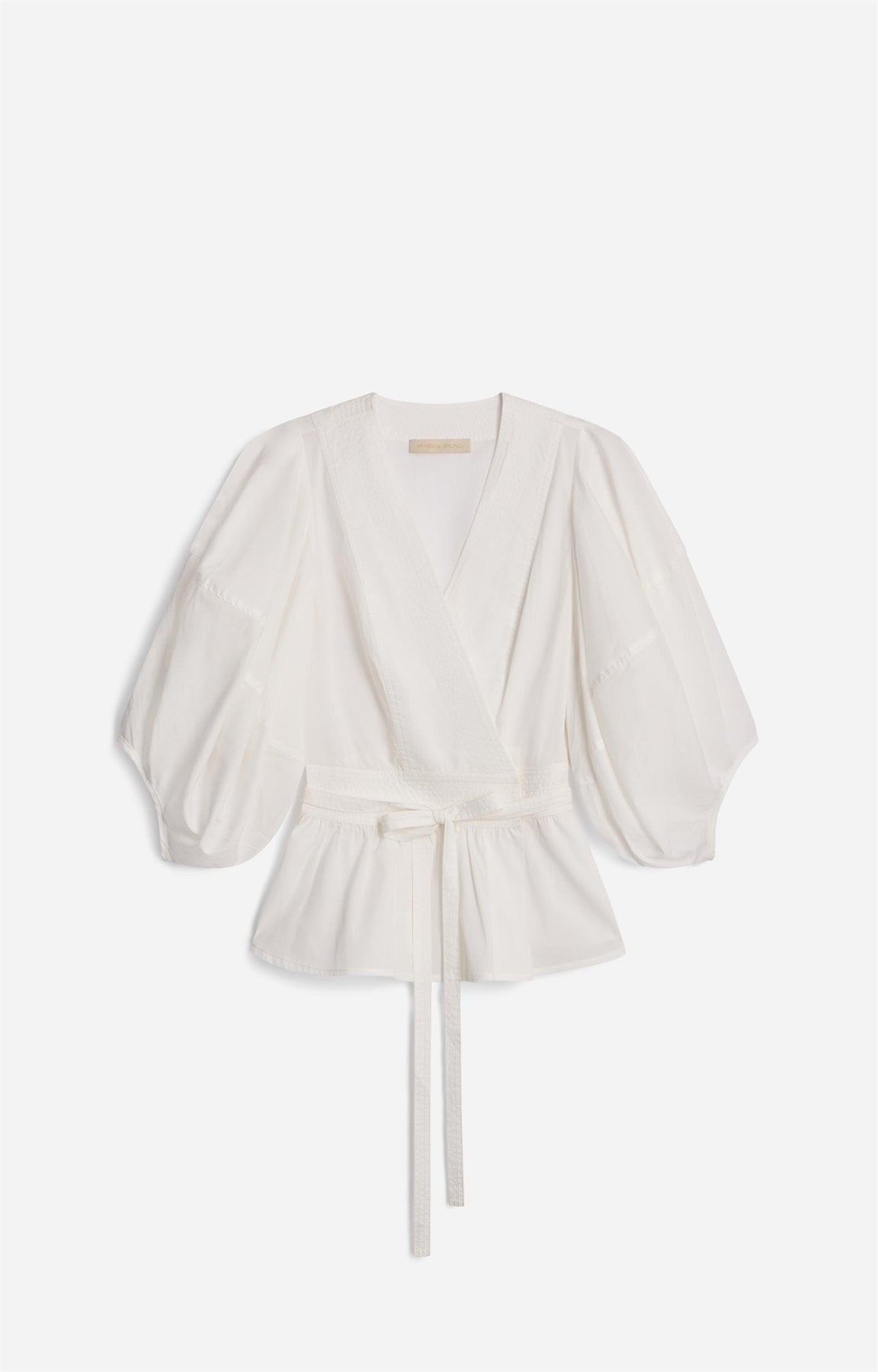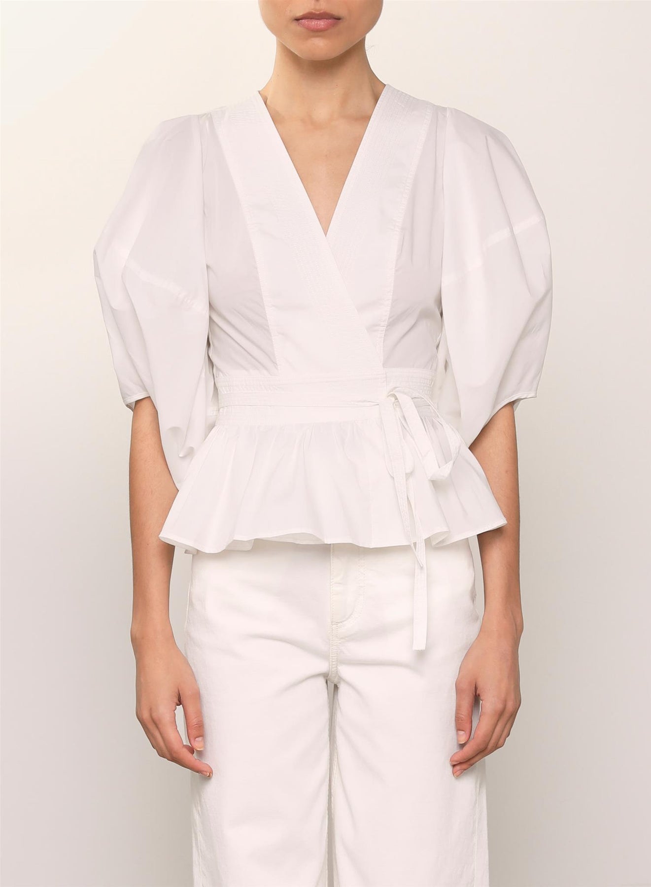 Blusen har korte puffermer og en flatterende omslagsfasong som knytes foran, noe som fremhever midjen på en elegant måte. Det luftige uttrykket gjør den perfekt for varmere dager, samtidig som de delikate detaljene gir et sofistikert preg.