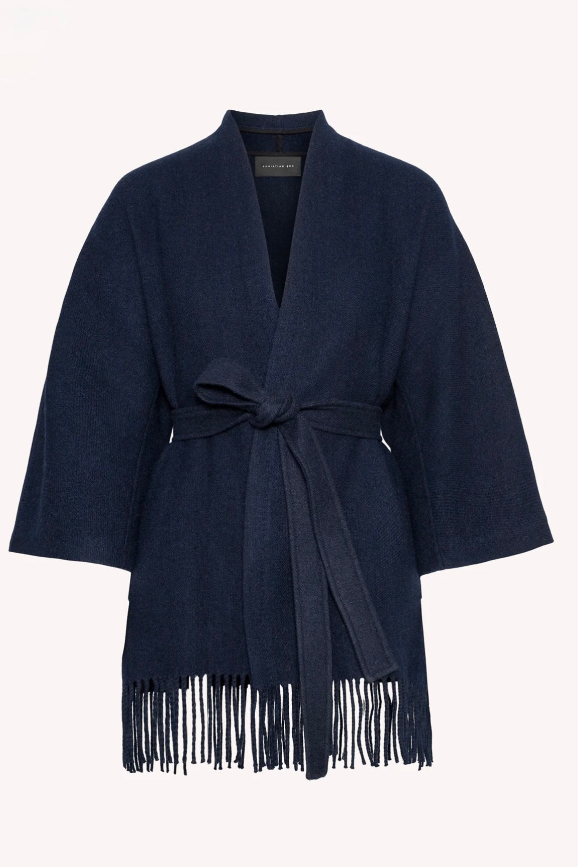 Akila Lambswool Jacket fra Christian Aks er en myk og elegant jakke i 100% lammeull, designet med et rent og tidløst uttrykk. Den er avsluttet med frynser nederst som gir et subtilt, dekorativt preg. Jakken har innvendige lommer i midjen og et belte i samme materiale som kan knytes for en mer definert silhuett. Innsiden er pent ferdigstilt med bomullspiping, og gjør jakken like anvendelig inne som ute.