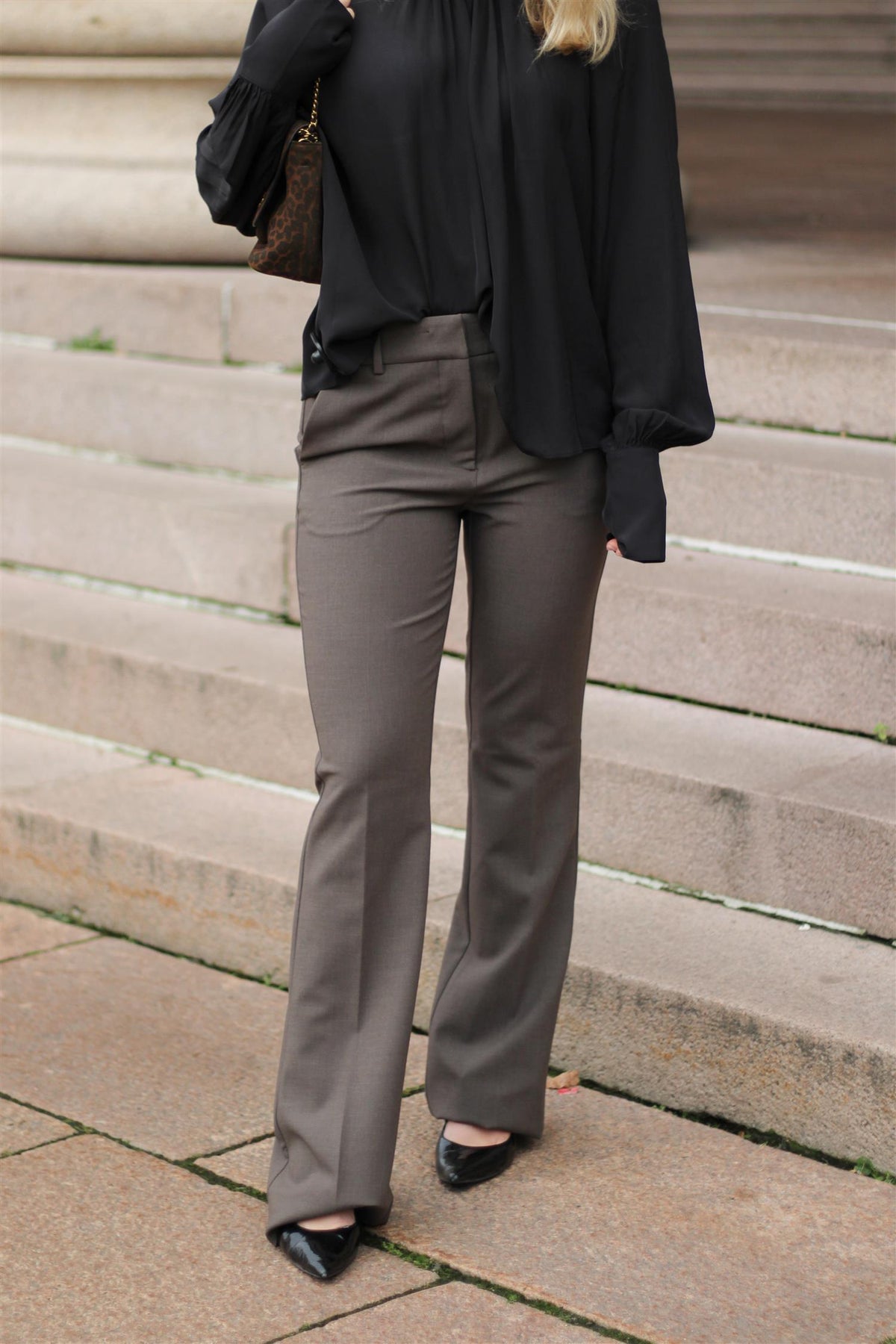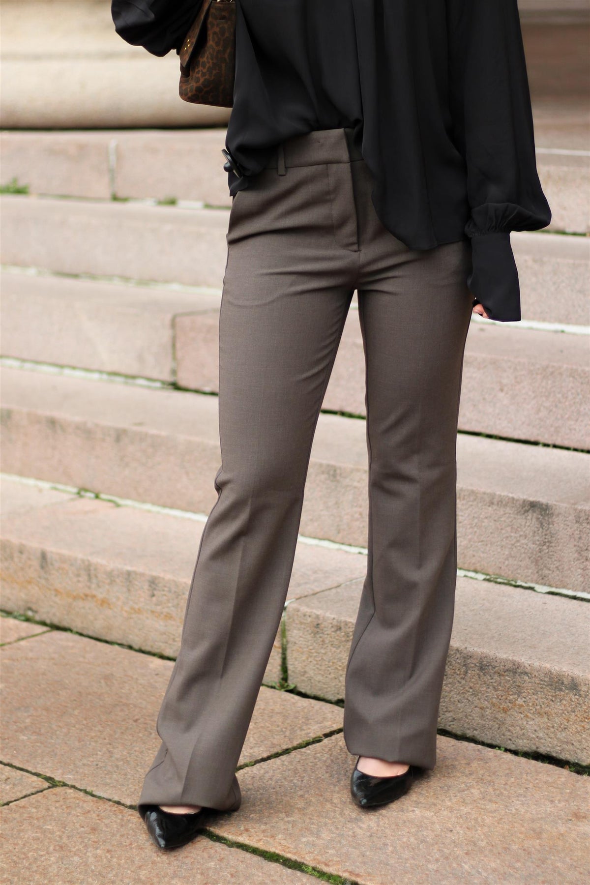 "Clara Long" fra Five Units i fargen Mud Brown. Elegante bukser med en klassisk flared fit. Designet med mid-waist, hviler de naturlig på hoftene, fremhever silhuetten og faller flatterende fra kneet og ned. Pressede folder og rene detaljer på bena gir et sofistikert preg, mens den allsidige passformen gjør dem enkle å style både til jobb og fritid. En tidløs bukse med et moderne uttrykk og et utsøkt snitt.