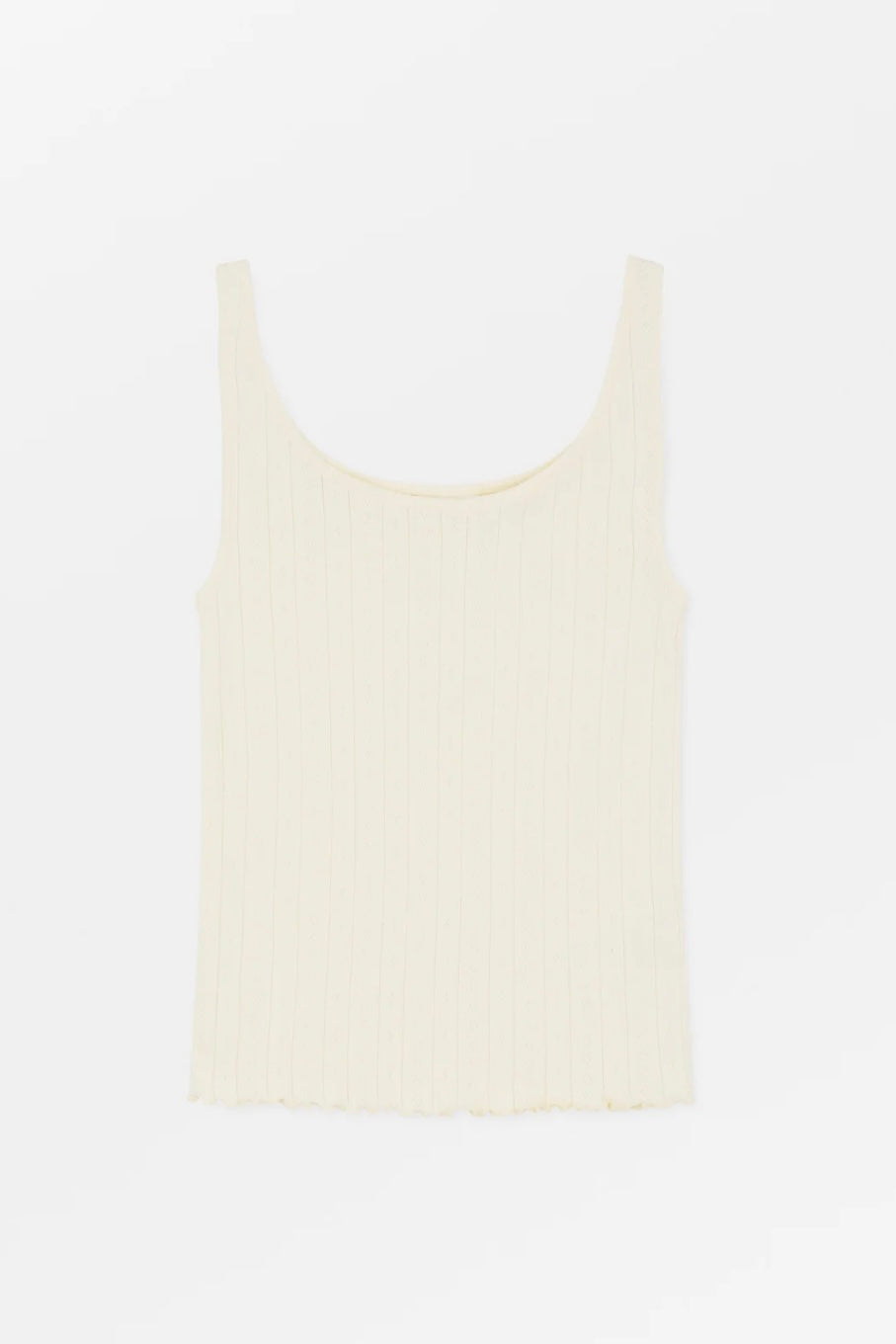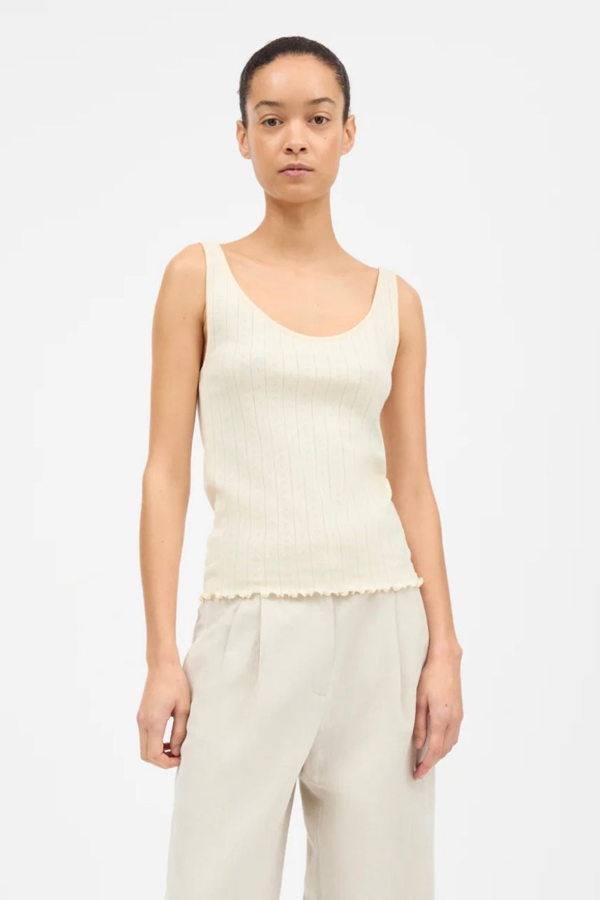 "Edie Low Back Top" fra Skall Studio i fargen butter. Denne toppen er laget i myk, pointelle-strukturert bomullsjersey med en lett og feminin tekstur. Designet har en lav rygg og dekorative babylock-kanter som gir et delikat og moderne uttrykk. Silhuetten er smal og figurnær, og plagget er designet for å sitte tett mot kroppen. Toppen er laget av GOTS-sertifisert økologisk bomull og produsert i India, med fokus på kvalitet og ansvarlig produksjon.