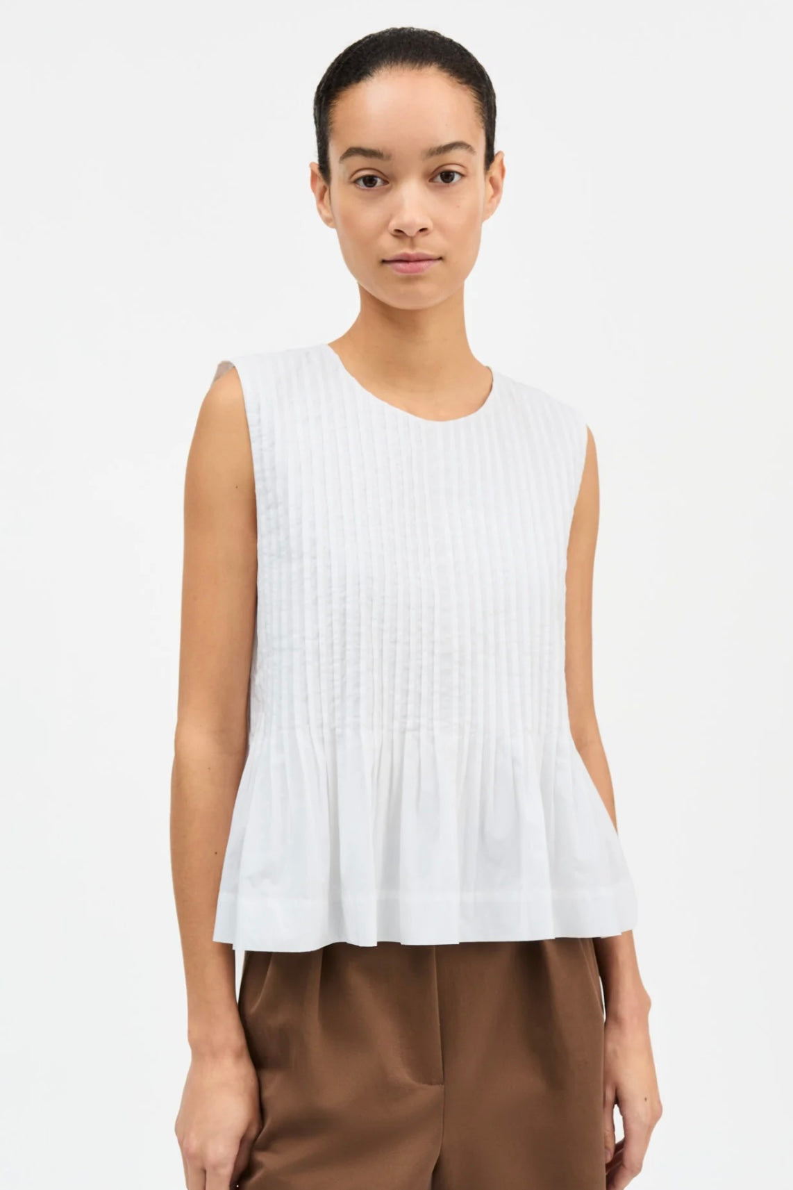 Pavlova Top fra Skall Studio. En feminin og luftig ermeløs topp med vakre rynker og en voluminøs silhuett. De mange pintuck-detaljene gir struktur og liv til designet, samtidig som den rene, avrundede halsen skaper et tidløst uttrykk. Toppen lukkes elegant med en knapp bak i nakken.