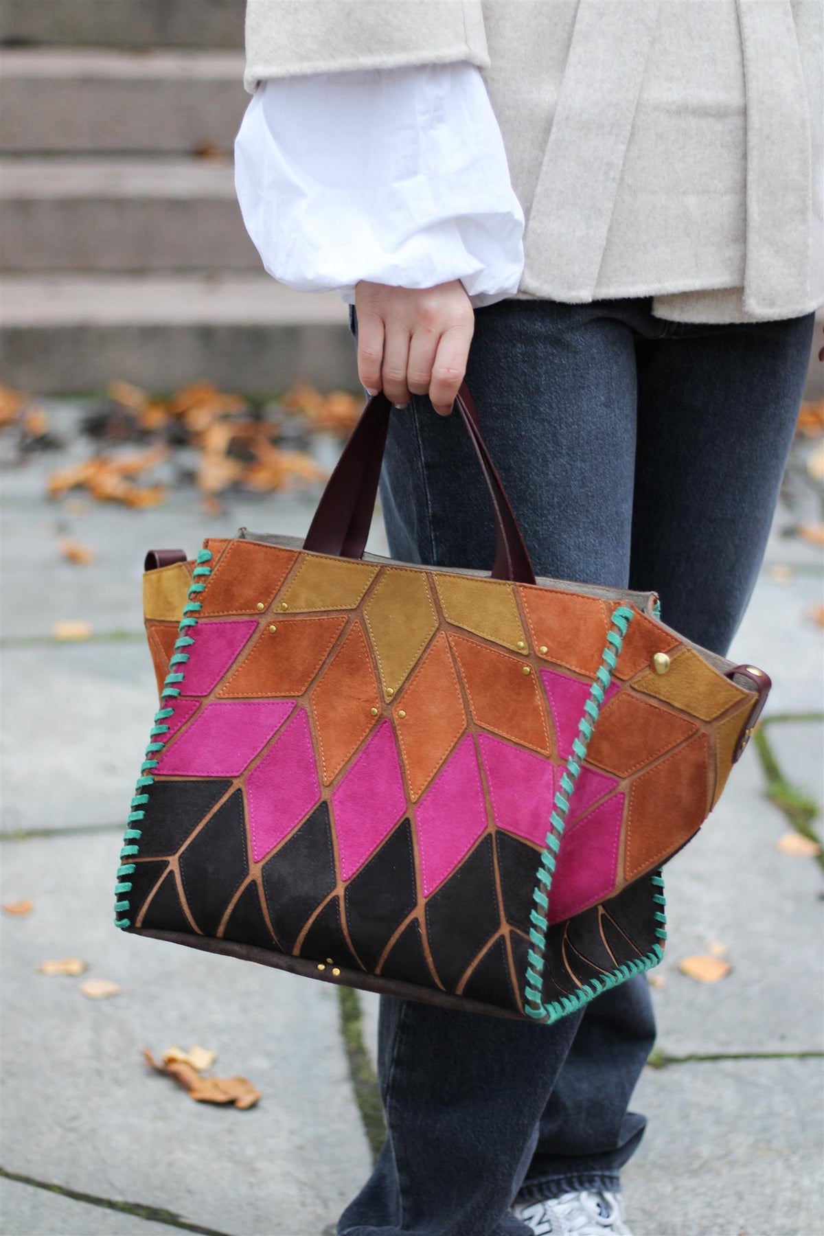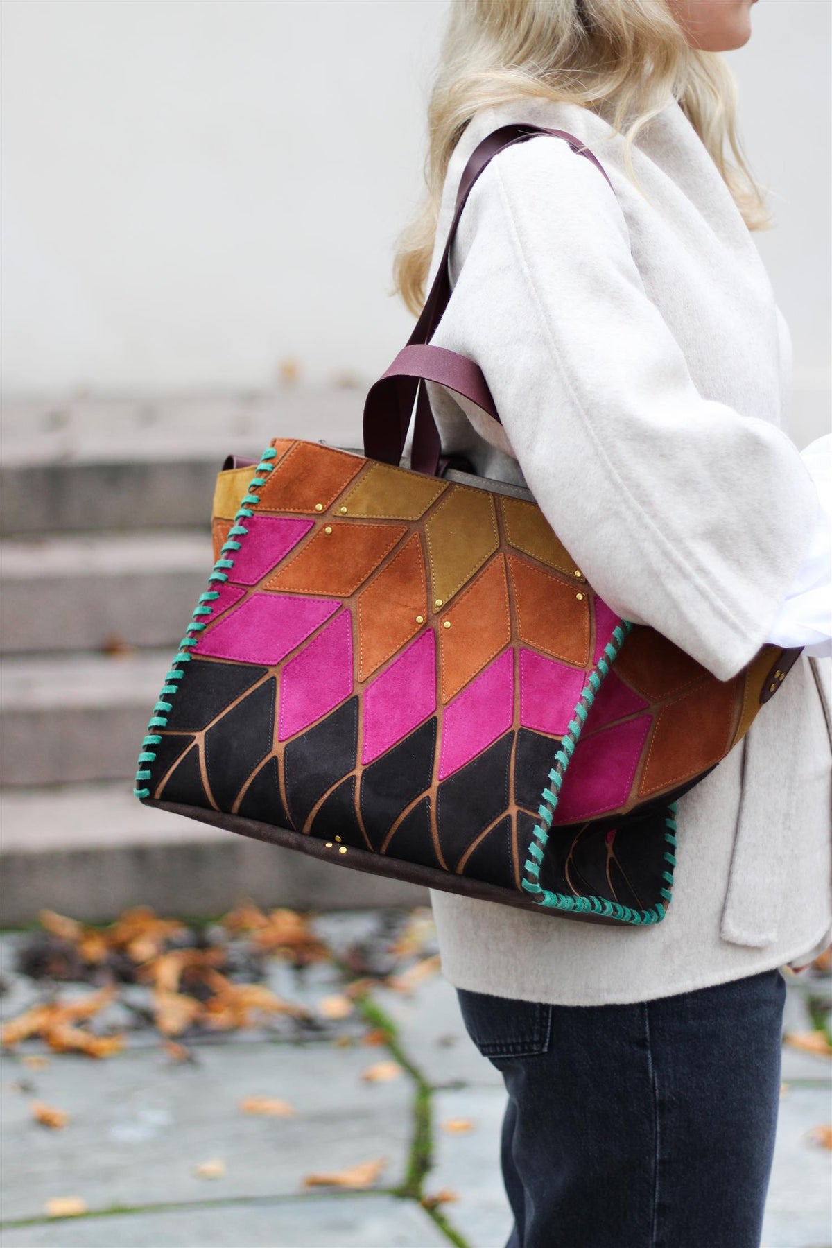 Leon M fra Jérôme Dreyfuss i fargen coucher de soleil. Stilren tote bag i semsket skinn som kan bæres både over skulderen og i hånden. Vesken har solide skinnhåndtak og lukkes med skinnfliker med trykknapper. Innsiden er godt organisert, med et romslig hovedrom og en praktisk skinnveske festet til en lenke for enkel tilgang til småting.