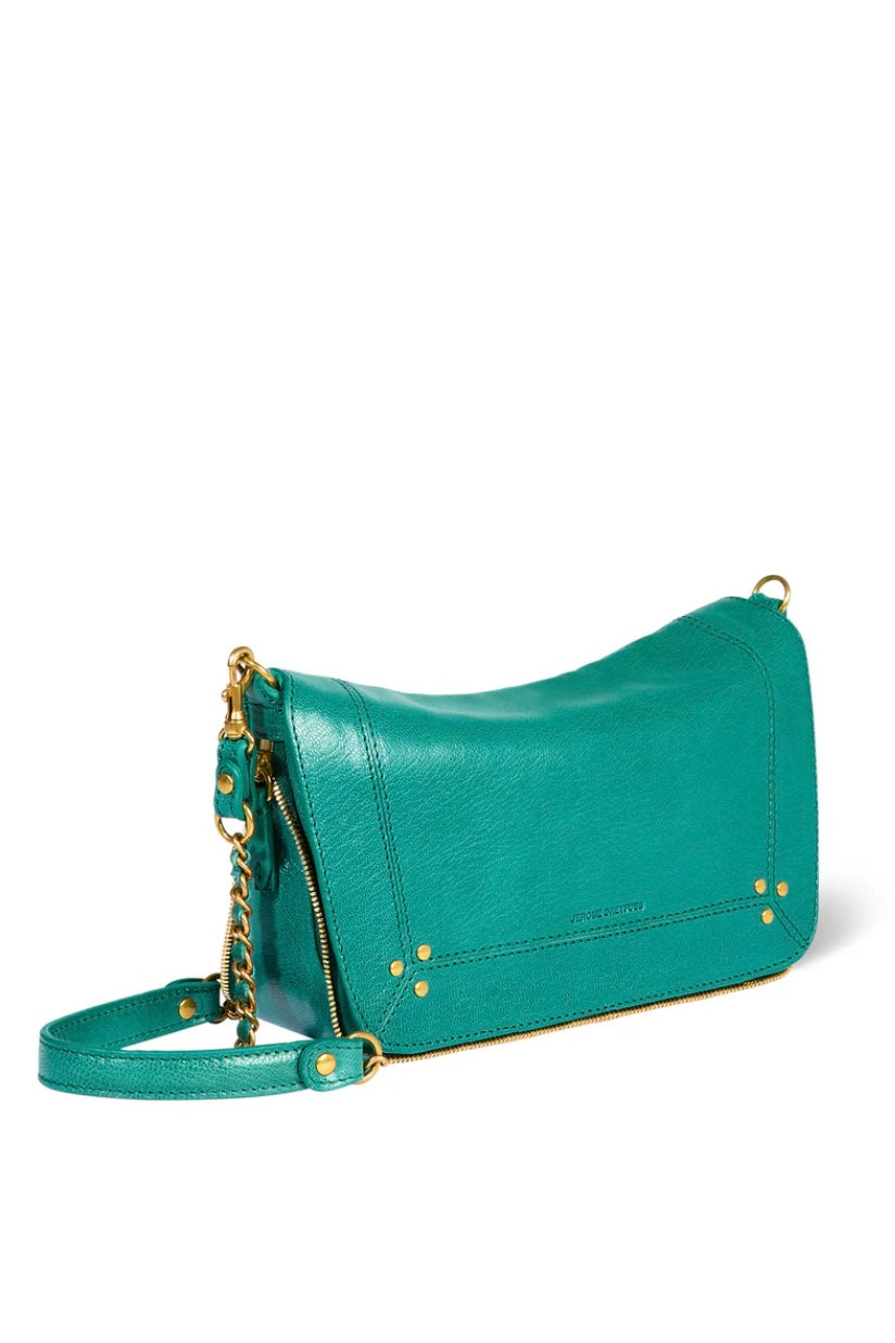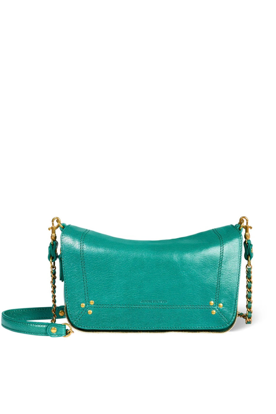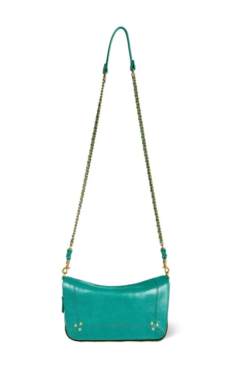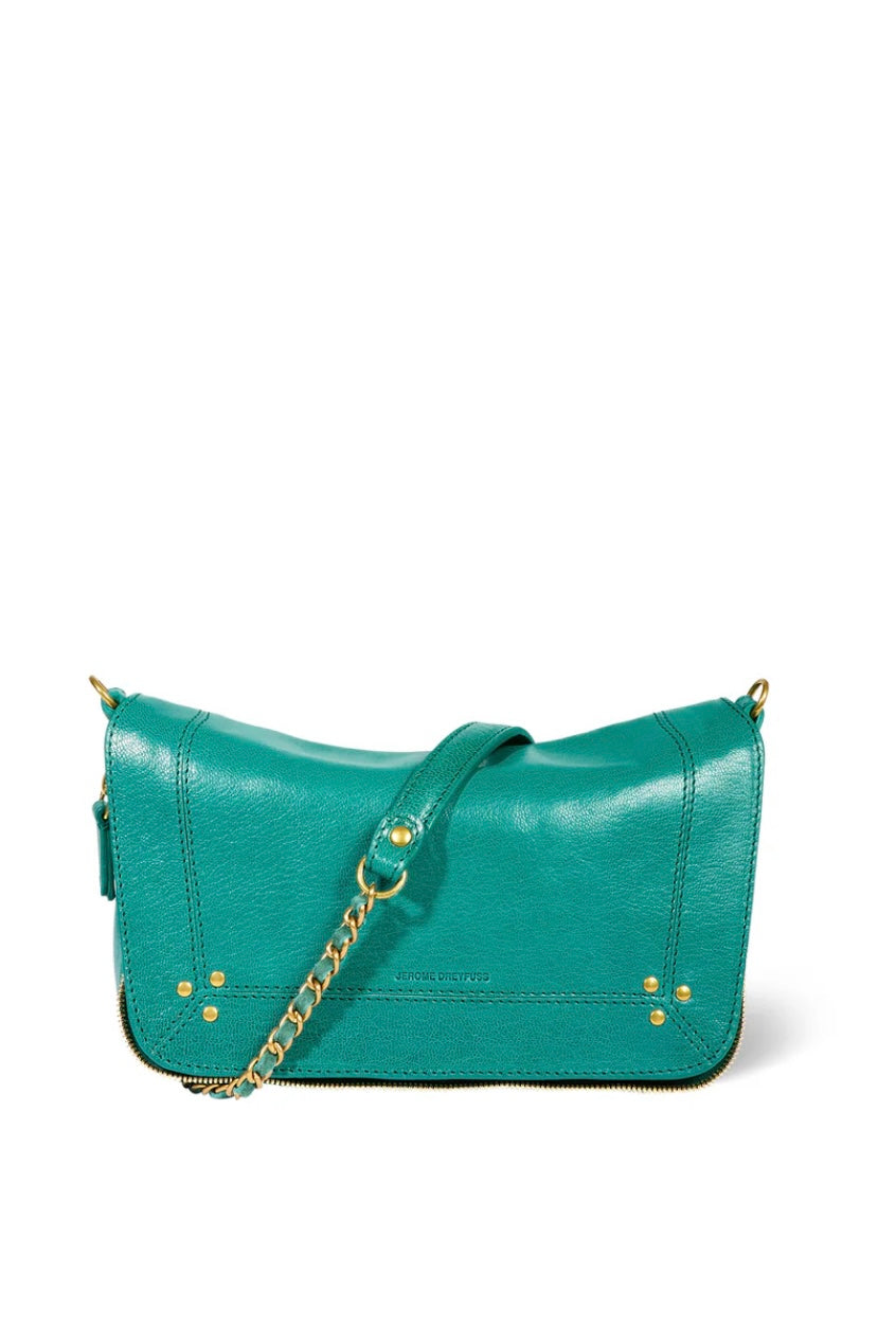 "Bobi S" fra Jerome Dreyfuss i fargen turquoise goatskin. Skulderveske som kan bæres over skulderen og cross-over. Avtagbar skulderreim i flettet lærkjede, lengde 105 cm. Lukkes med en klaff i magnetisk lær. Vesken har ett stort hovedrom.