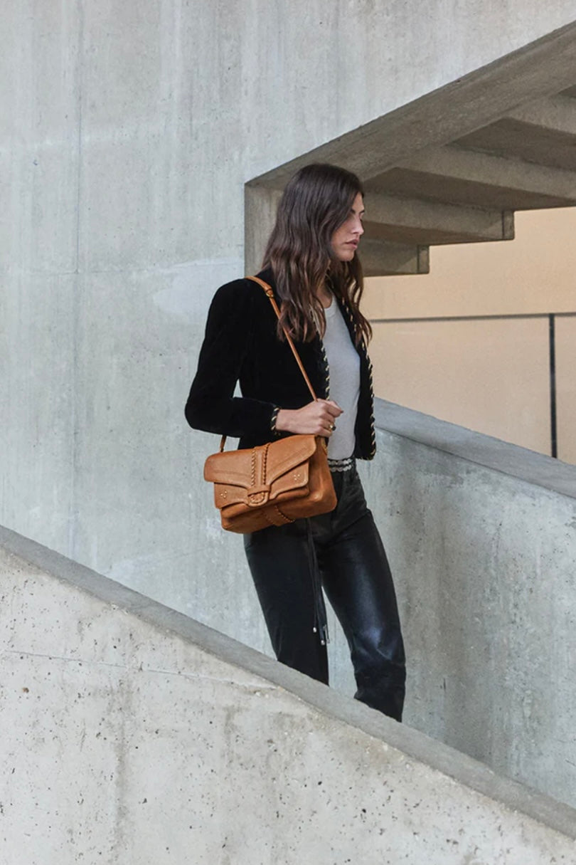 «Harry M» fra Jerome Dreyfuss i camel lambskin, er en allsidig og funksjonell veske laget i mykt lammeskinn. Den justerbare skulderremmen kan tilpasses fra 87 cm til 125 cm, og gjør det mulig å bære vesken både over skulderen og crossbody. Vesken har et romslig hovedrom, en frontlomme med innvendig klaff, samt en flat glidelåslomme nederst i hovedrommet for sikker oppbevaring. Den håndflettede klaffen lukkes med en løkke og gir vesken et karakteristisk og gjennomført uttrykk. Vesken er helfôret i bomull.