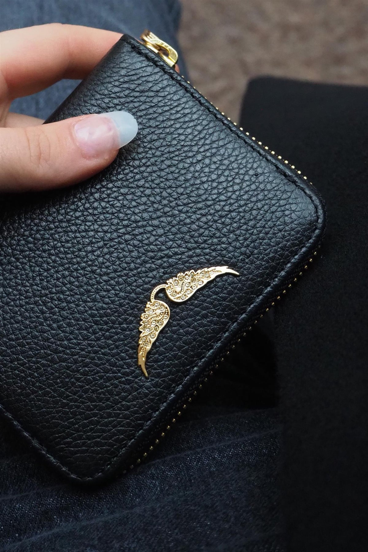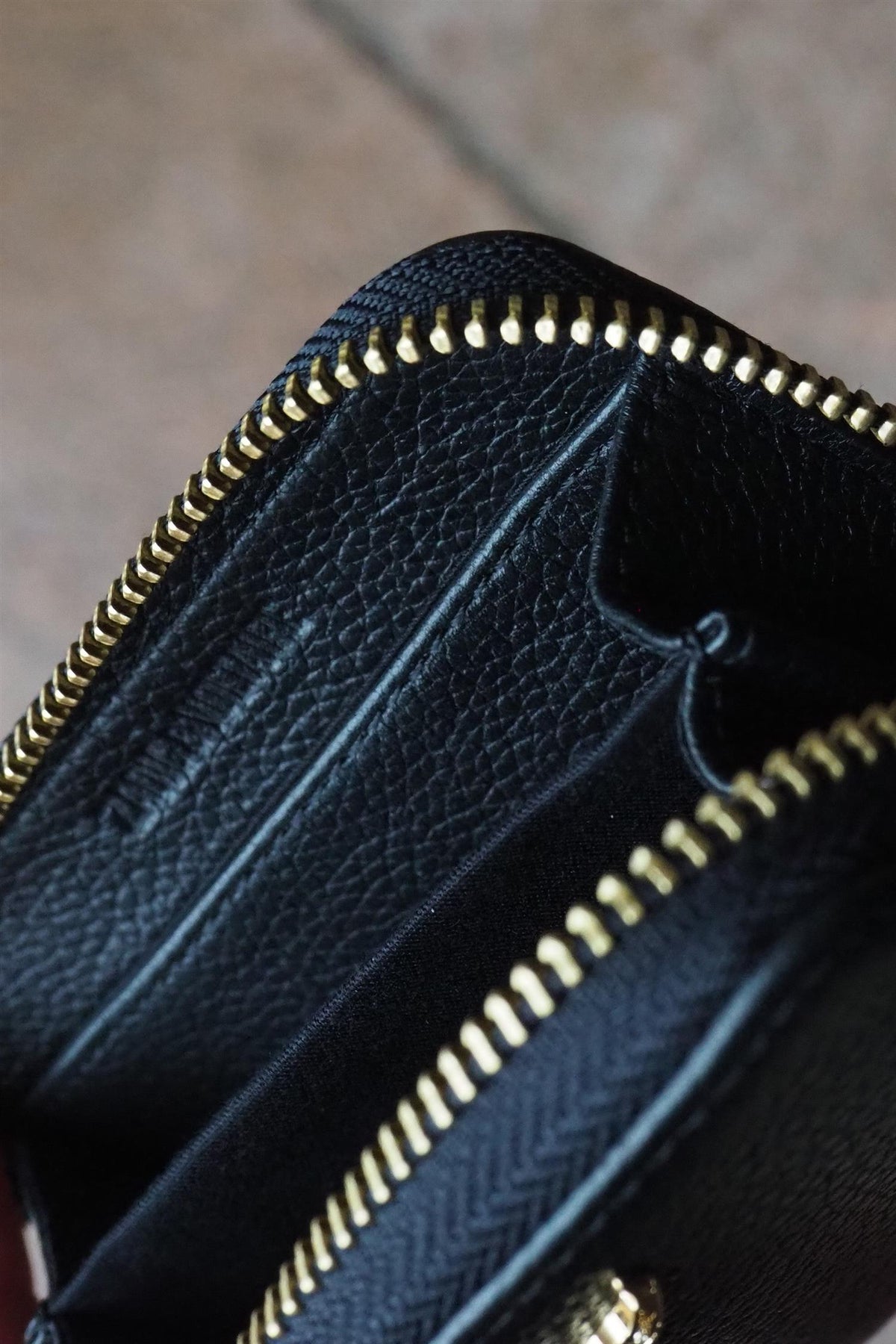 "Mini ZV Grained Leather" fra Zadig & Voltaire. Liten lekker sort lommebok. Teksturert skinn med gullfarget logo og glidelås. 2 kortlommer.
