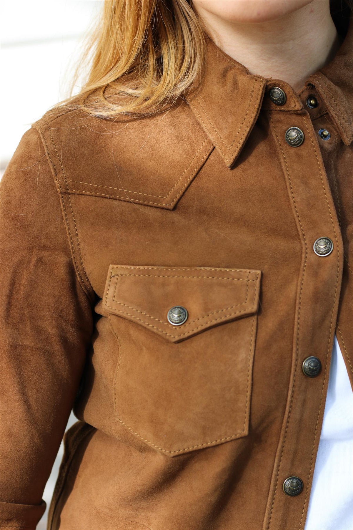 "Thelma Suede Leather Shirt" fra Zadig & Voltaire. En tidløs skjorte i eksklusivt semsket geiteskinn. Modellen har et kroppsnært snitt med klassisk skjortekrage, trykknapplukking og to brystlommer med klaff. Lange ermer med mansjetter gir et sofistikert og strukturert uttrykk. Den semskede overflaten tilfører skjorten et luksuriøst preg, og passformen gjør den både feminin og tidløs. Bruk den alene som en topp, eller åpen over en enkel T-skjorte for en mer avslappet look.
