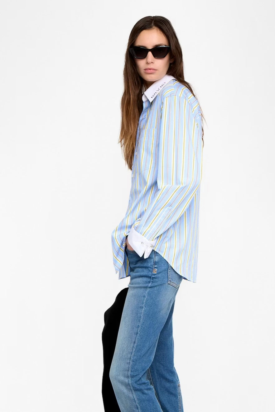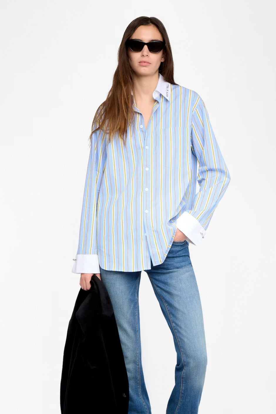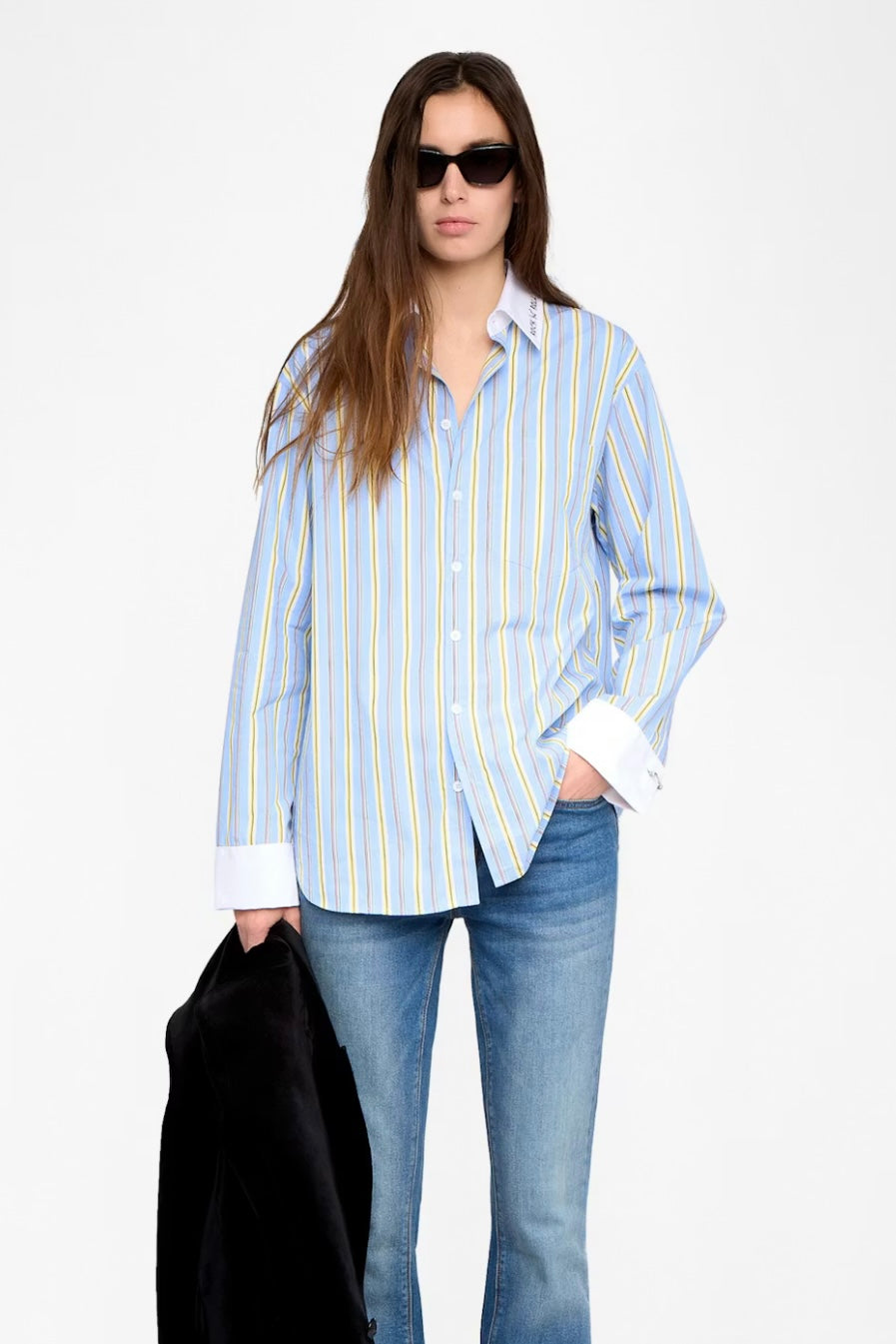 "Morning Pop Shirt" fra Zadig & Voltaire er en stripet skjorte i klassisk poplin, laget i 100 % bomull med et avslappet og moderne uttrykk. Modellen har en kontrastfarget, klassisk krage, broderte detaljer og en påsydd brystlomme som gir skjorten et karakteristisk preg. De lange ermene avsluttes med kontrastmansjetter, og knappelukkingen i front gir en tidløs silhuett. Skjorten er designet med oversized passform. Ønsker du en mer kroppsnær fasong, anbefales det å velge én størrelse mindre enn normalt.