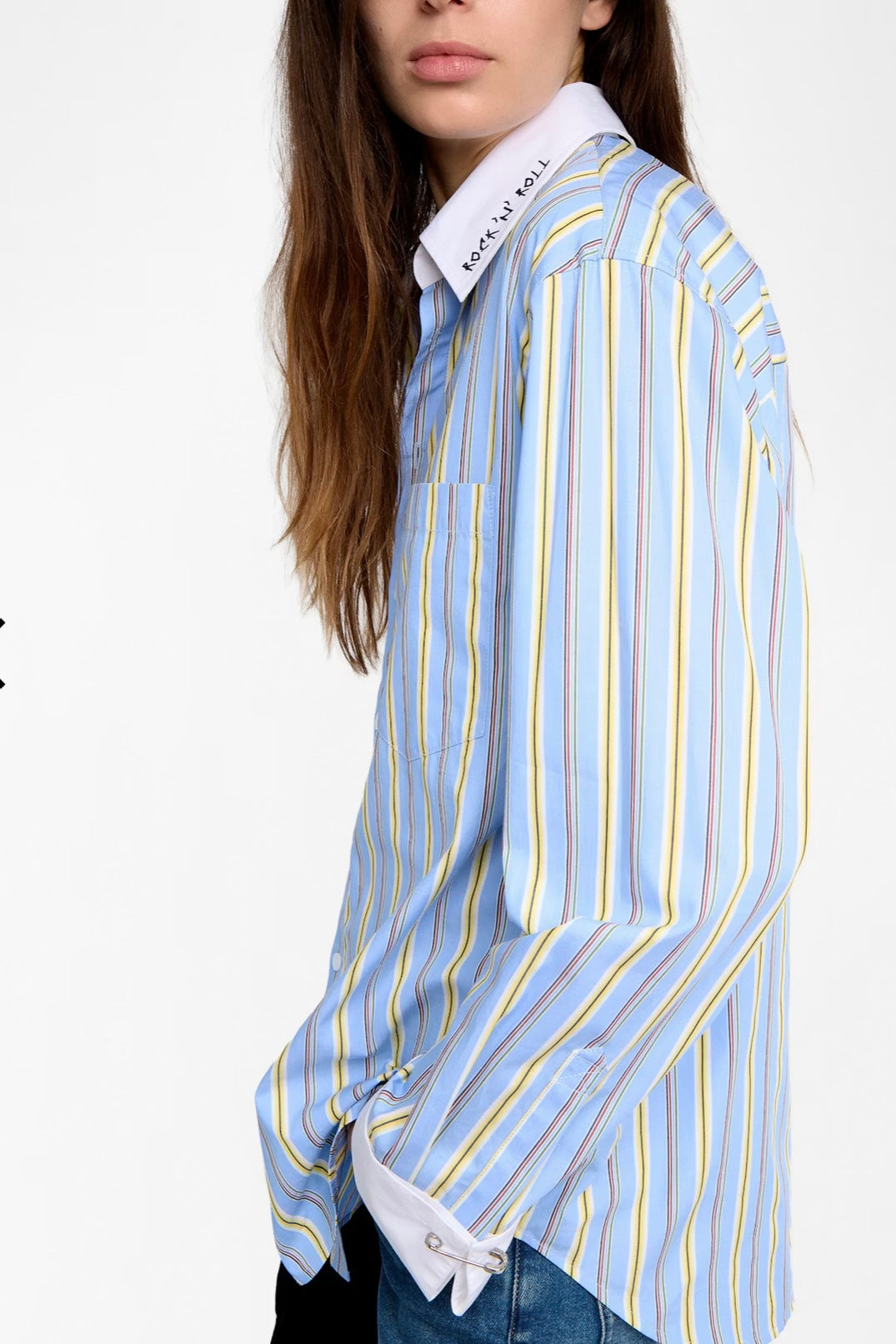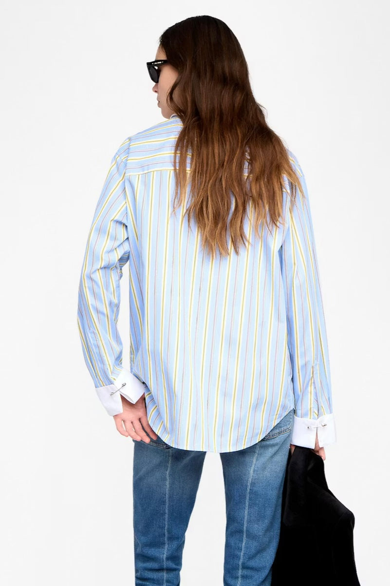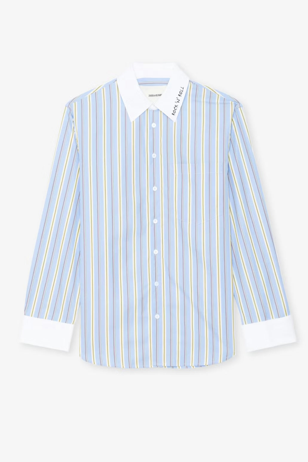 "Morning Pop Shirt" fra Zadig & Voltaire er en stripet skjorte i klassisk poplin, laget i 100 % bomull med et avslappet og moderne uttrykk. Modellen har en kontrastfarget, klassisk krage, broderte detaljer og en påsydd brystlomme som gir skjorten et karakteristisk preg. De lange ermene avsluttes med kontrastmansjetter, og knappelukkingen i front gir en tidløs silhuett. Skjorten er designet med oversized passform. Ønsker du en mer kroppsnær fasong, anbefales det å velge én størrelse mindre enn normalt.
