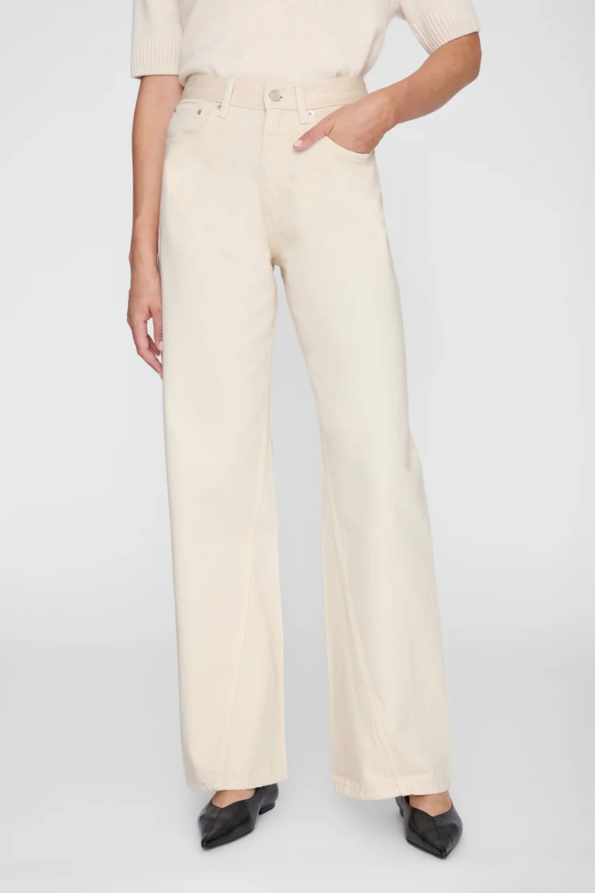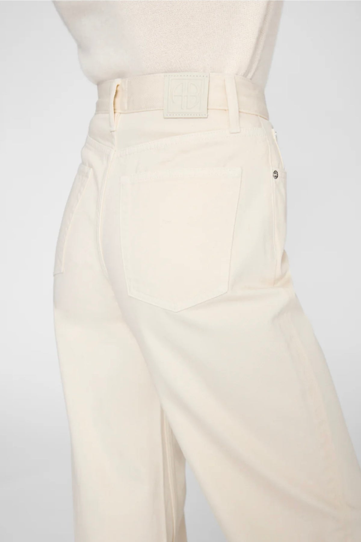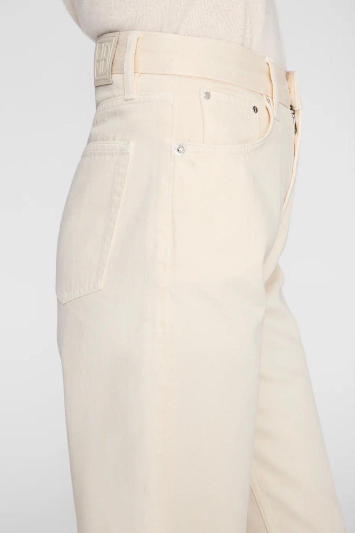 Brie Jeans fra Anine Bing i fargen cream. Avslappet denim med moderne silhuett, laget i rigid bomullsdenim uten stretch. Den myke kvaliteten gir et naturlig fall og et komfortabelt uttrykk. Buksen har høyt liv, vid og baggy passform samt lang benlengde som gir en uanstrengt og moderne look. Den er designet med klassisk femlommersdesign, knappelukking i front og rene kanter nederst. Vridde sidesømmer gir et subtilt og karakteristisk preg som tilfører jeansen ekstra personlighet.